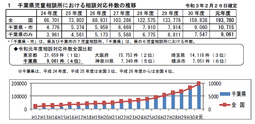 「千葉県HP 令和元年度千葉県の児童虐待の状況について(確定値)(https://www.pref.chiba.lg.jp/jika/gyakutai/jidou/documents/jidougyakutaikakuteichikaisei.pdf)」