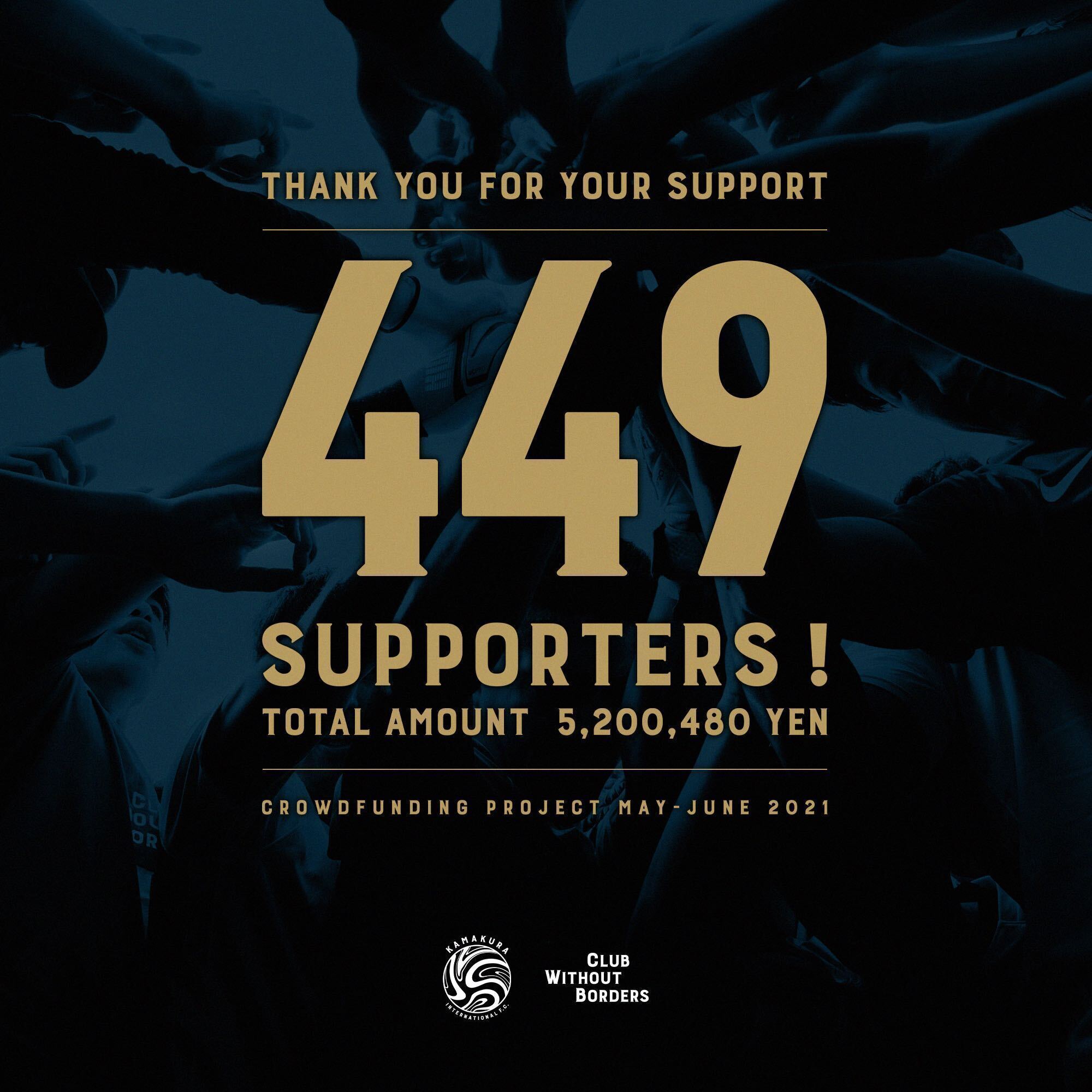 昨日(6月27日)の23時59分をもって、鎌倉インテルのクラウドファンディングが終了いたしました!この実施期間で【449名】の皆さまにご支援をいただきました!目標を遥かに上回る結果となり、私たちも驚きと嬉しさで一杯です!10月には皆さまと共にインテルのグッズを身にまとい、鎌倉みんなのスタジアムで盛り上がれる日がやってくることを心より願っております!トップチーム、サテライトチームともに昨日の試合は悔しい結果に終わりましたが、皆さまへ良いご報告がお届けできるように引き続き、チーム一丸となって戦ってまいりますので応援よろしくお願いいたします!今度は「鎌倉」でお会いしましょう!皆さまからのご支援、誠にありがとうございました!鎌倉インターナショナルFC 一同