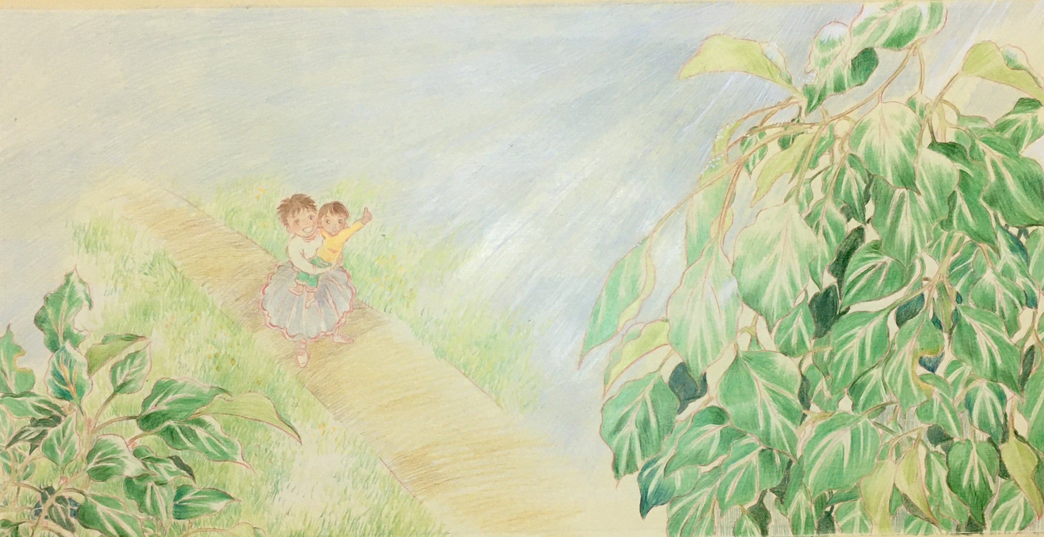 特に右側の樹木の葉の色付けに時間がかかってしまいましたが、ゆきの言う通り、風や光などの自然を主役にしたほうが広がりが感じられ、描いた私も大満足の出来になりました!