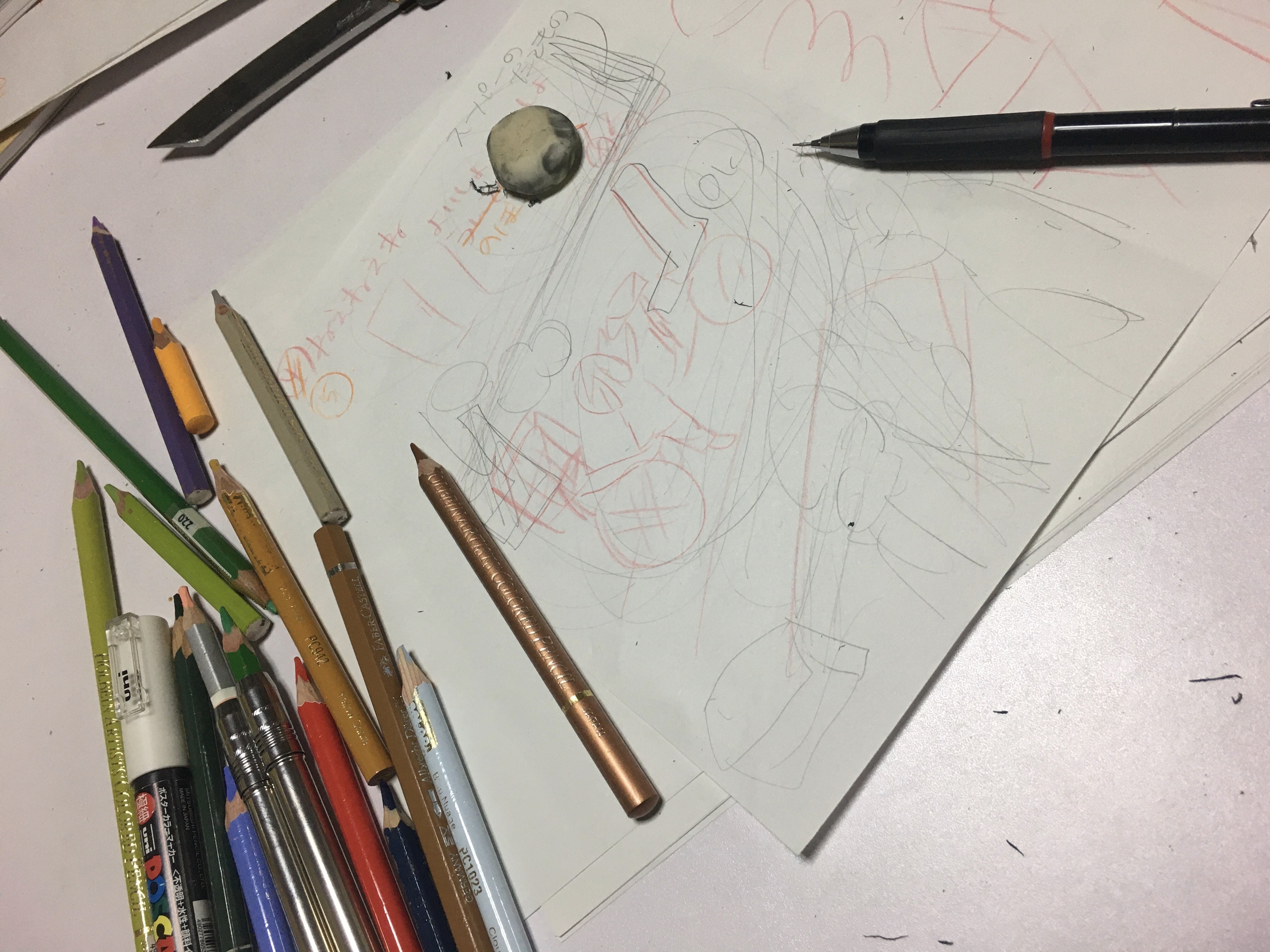 紙に描かれているのは、下書きのそのまた下書きですが、線の乱れが苦手さ加減を物語ってます