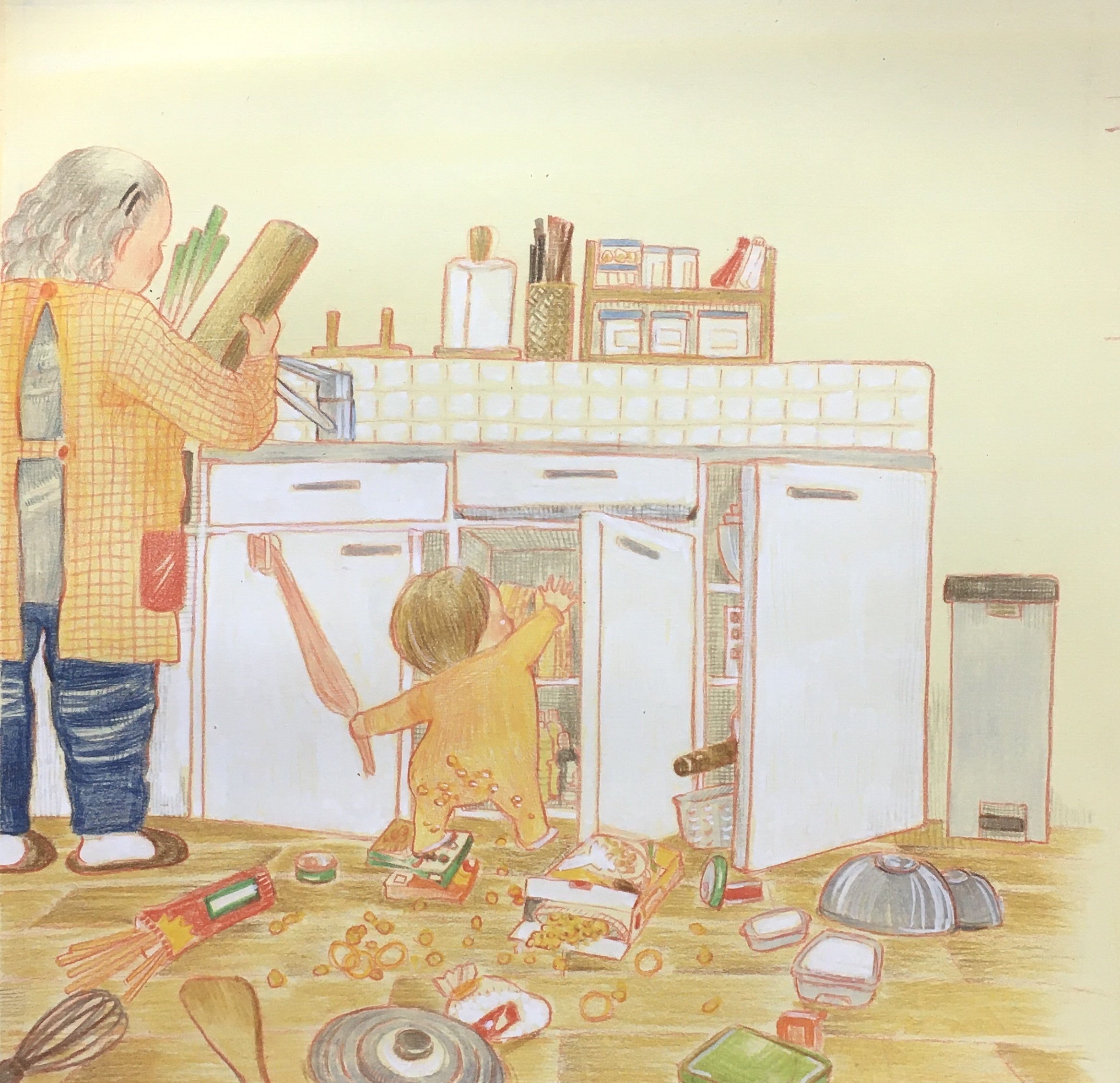 皆さま、おはようございます出来立てホヤホヤ、まさしく子どもの欲望満載のイラストになりました!赤ちゃんが台所の開きの中の物を次々取り出しています親御さんからしてみれば、悲鳴をあげそうな状況ですね!後片付け、どれくらいの時間かかるのか…考えるだけでも頭痛くなりそうですが、これは大人の都合でしかないんですよねこんな状態でも黙々と料理の準備するおばあちゃん…何気にお気に入りです怒らずに、ただ見守っている。この子の気が収まるまで放っといてあげようかね、そんな声が聞こえてきそうですゆとりを持って、子どもを見ることができる。そんな私の理想がこのイラストには投影されています