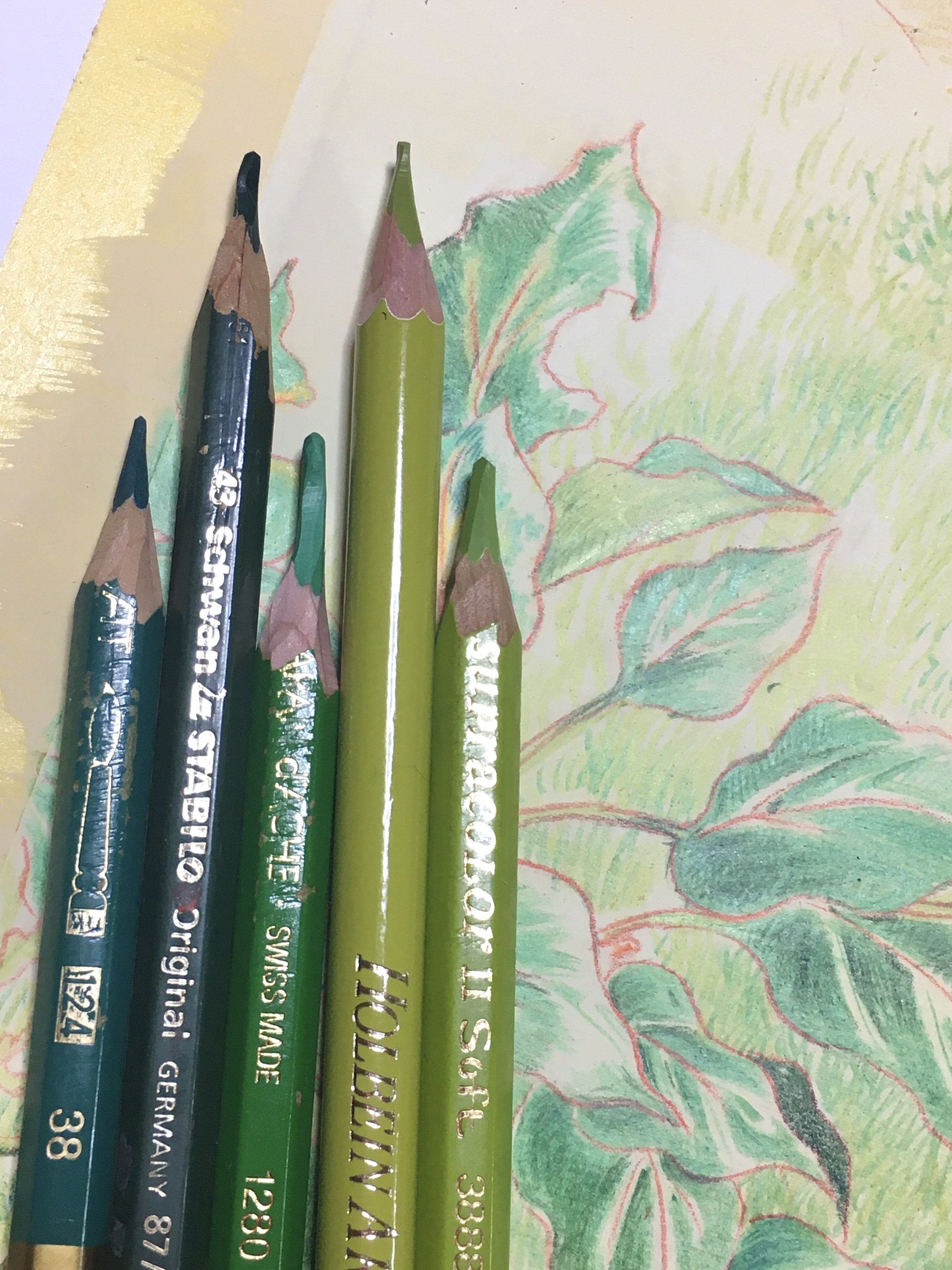 皆さま、おはようございます!もうすぐ関西も梅雨入りしそうです。この時期はなかなかスッキリしない日が続くので憂鬱、という方も多いと思いますが、私は結構この季節が好きです。(ただし湿度は別ですが…)その理由は、緑の色が濃くなって、季節の移り変わりが感じられるからです。春の優しい色合いよりも濃くなっていく緑を見ると、ああ夏も近いのだなあと感じます。私は今、緑の葉を描いていますが、その緑色は5色使っています。陽が当たる場所によって、色の濃淡が違うので塗り分けています。葉を見て、光や風の揺らぎなどを感じていただけたら嬉しいです。
