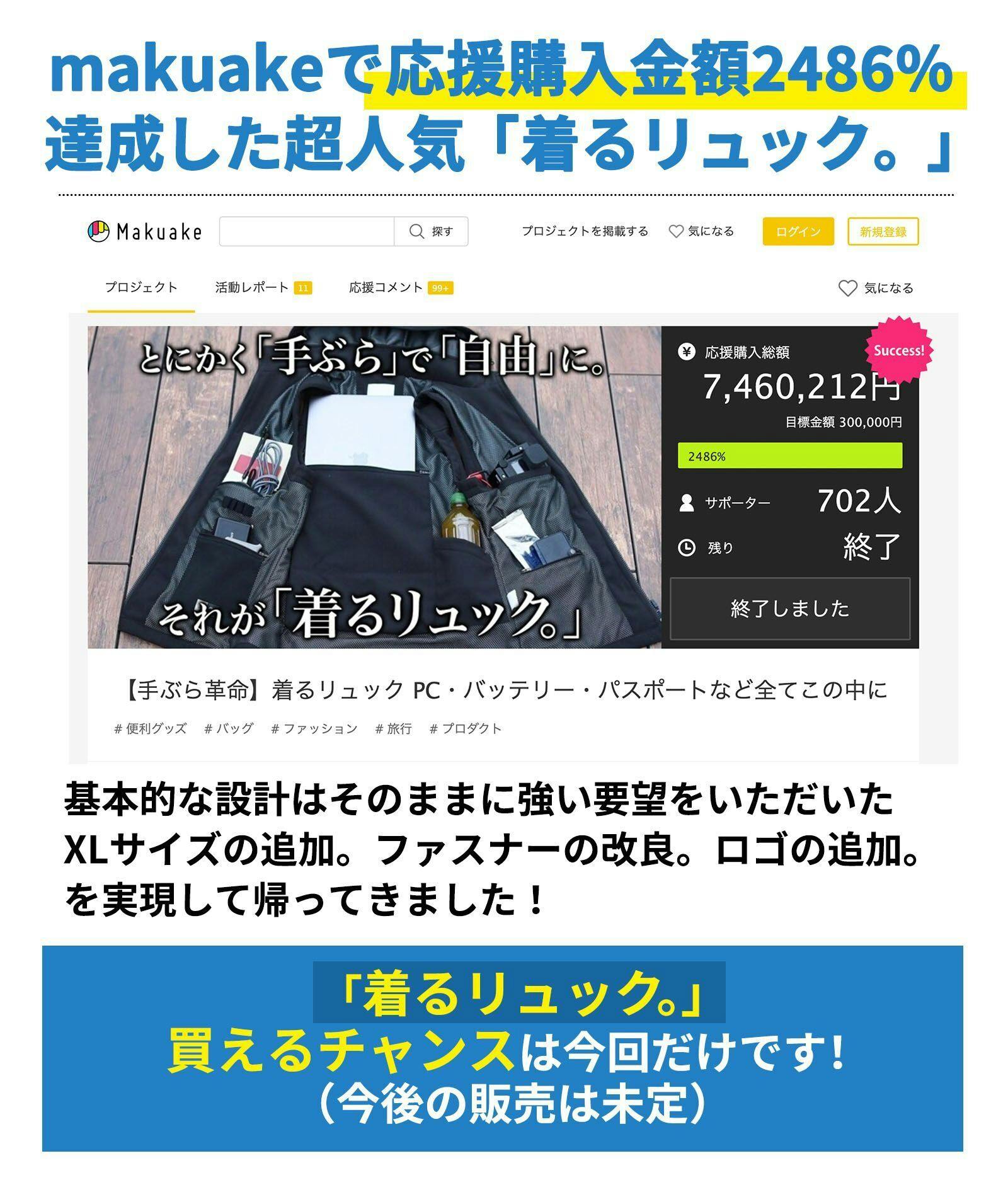 2021/12/14 22:38ありがとうございます。!大好評をいただいている着るリュック。"残すところあと1日になりました。開発者の先輩のリュックが盗まれた体験をきっかけに旅のプロのYouTuberもーりー様を監修に開発が始まったこの着るリュック。もっと多くの方にこの商品の良さと私たちの想いを伝えていきたい。ぜひ、皆様のお力で SNS等にアップしていただけると大変嬉しいです。また、別件ですが私たちの着るリュック。が最終日にキャンプファイヤー様のメインページに掲載されました。大変嬉しいです。泣お一人おひとりのご支援や応援、お気持ちが本当に嬉しくて、ご支援いただくたび湧き上がる喜びを噛みしめております。残り少ないプロジェクトですが是非、最後までよろしくお願いします。*購入者様へ、サイズを選択されていない方についてはメッセージより希望サイズをご教示願います。着るリュック。スタッフ一同。 もっと見る進捗状況について-先行手配分商品検品終了(12/11)