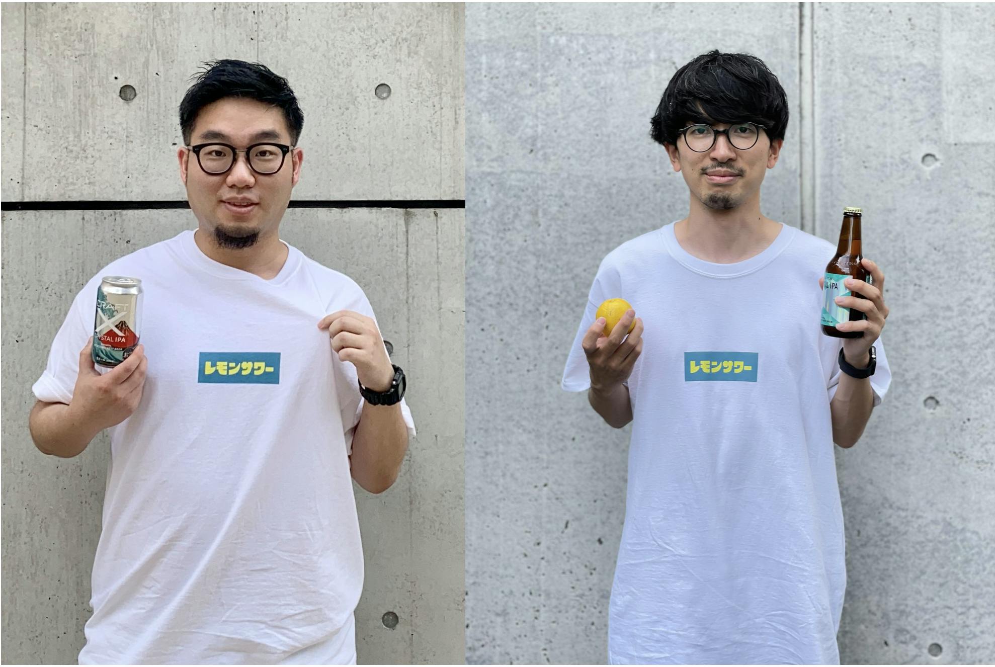 今回は、One Dropさんの大人気商品「ふくだ レモンサワーTshirt」をベースに、無添加レモンサワー「PULEMO」とのコラボを記念したオリジナルデザインを制作し、新たにリターンとして提供開始します!コラボを記念して(?)One Dropブランドディレクターの杉目さんと、CRAFT Xブランドディレクターの松田が「ふくだ レモンサワーTshirt」を着てみました!おもしろいものができそう・・・ですよね!
