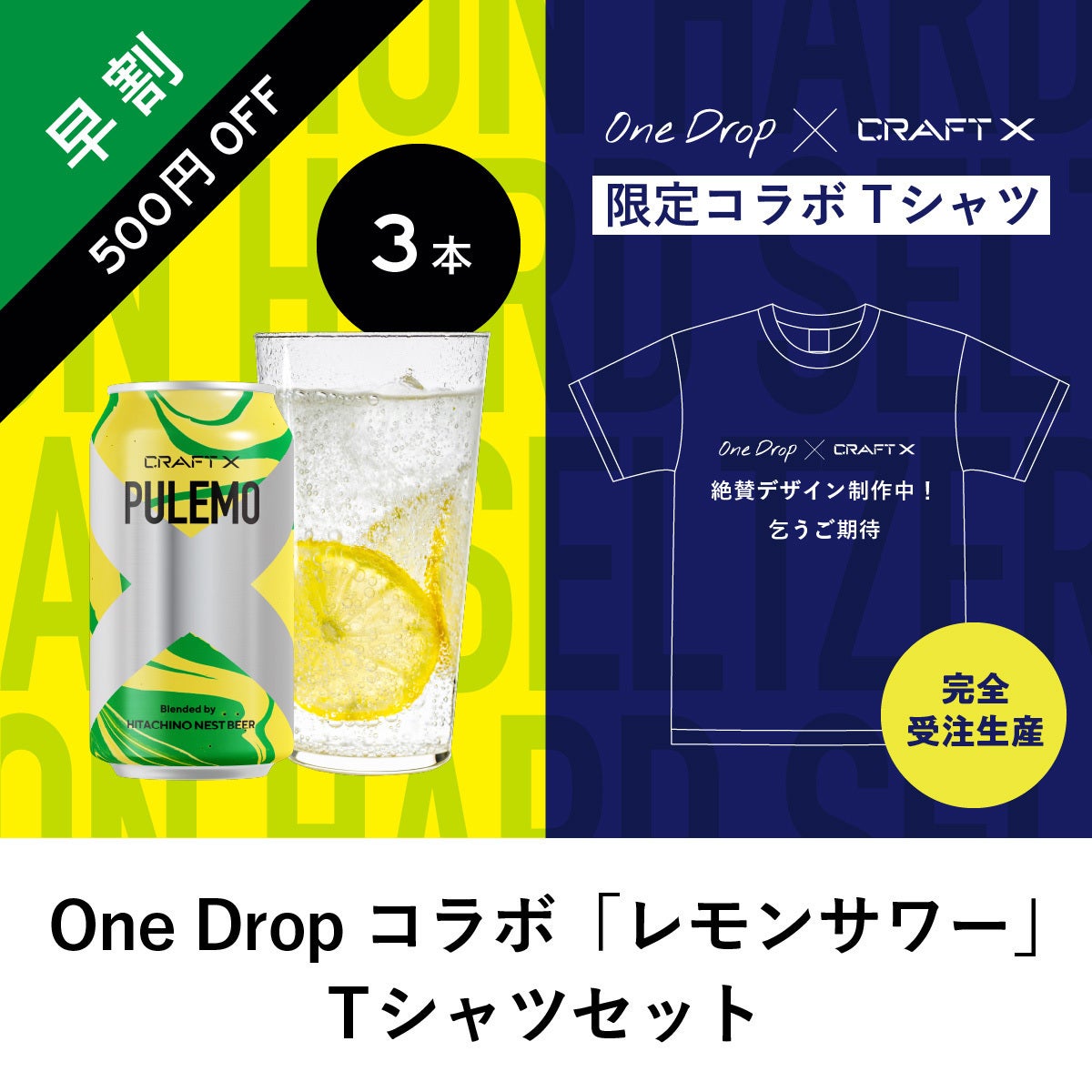 One Dropさまの大人気商品「ふくだレモンサワーTshirt」をベースに、PULEMOのエッセンスを混ぜ込んだオリジナルコラボTシャツ。「One Dropコラボ「レモンサワー」Tシャツセット(税込6,500円)」は完全受注生産・限定コラボTシャツにPULEMO3缶がついたセットです!
