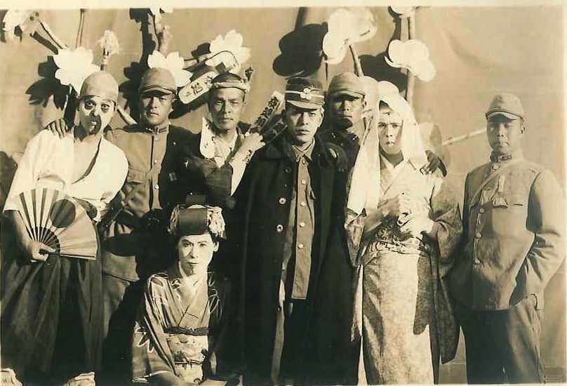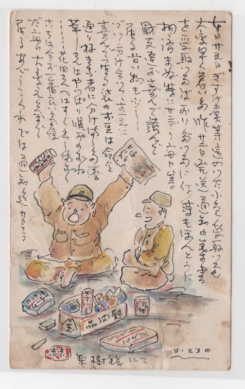 福岡から届いた荷物(慰問箱)に大喜びする半次と戦友。 とにかく元気な姿を描くことで、家族を心配させないようにしていたのだと思います。手にはサンデー毎日、そして、中洲にあった百貨店「福岡玉屋」の箱も描かれています。
