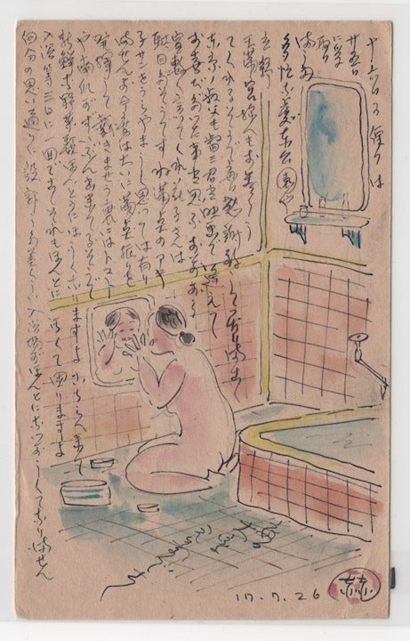 満州では「入浴など3日に1回です それもほんとに汚くて困りますよ」。妻の禮子(祖母)が風呂に入る 姿を描き、「自分の思い通りに設計した美しい入浴場がほんとになつかしくてなりません」と書かれています。