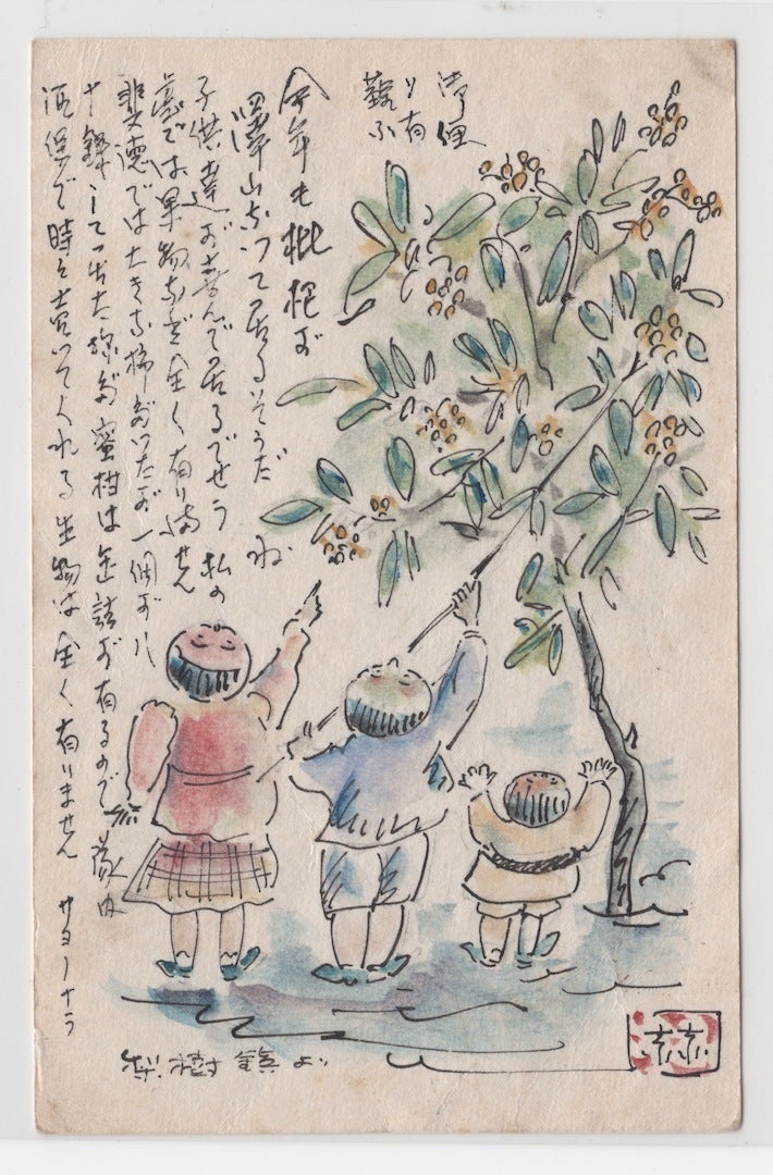 裏庭で実ったビワをつつく3人の我が子。 半次が満州に渡ったのは、末っ子の允博(右端、私の父)が生後6か月の時でした。何年も会えないままですので、子ども達が大きくなった姿を想像して描き、こんな日常に戻りたいと願っていたのだと思います。