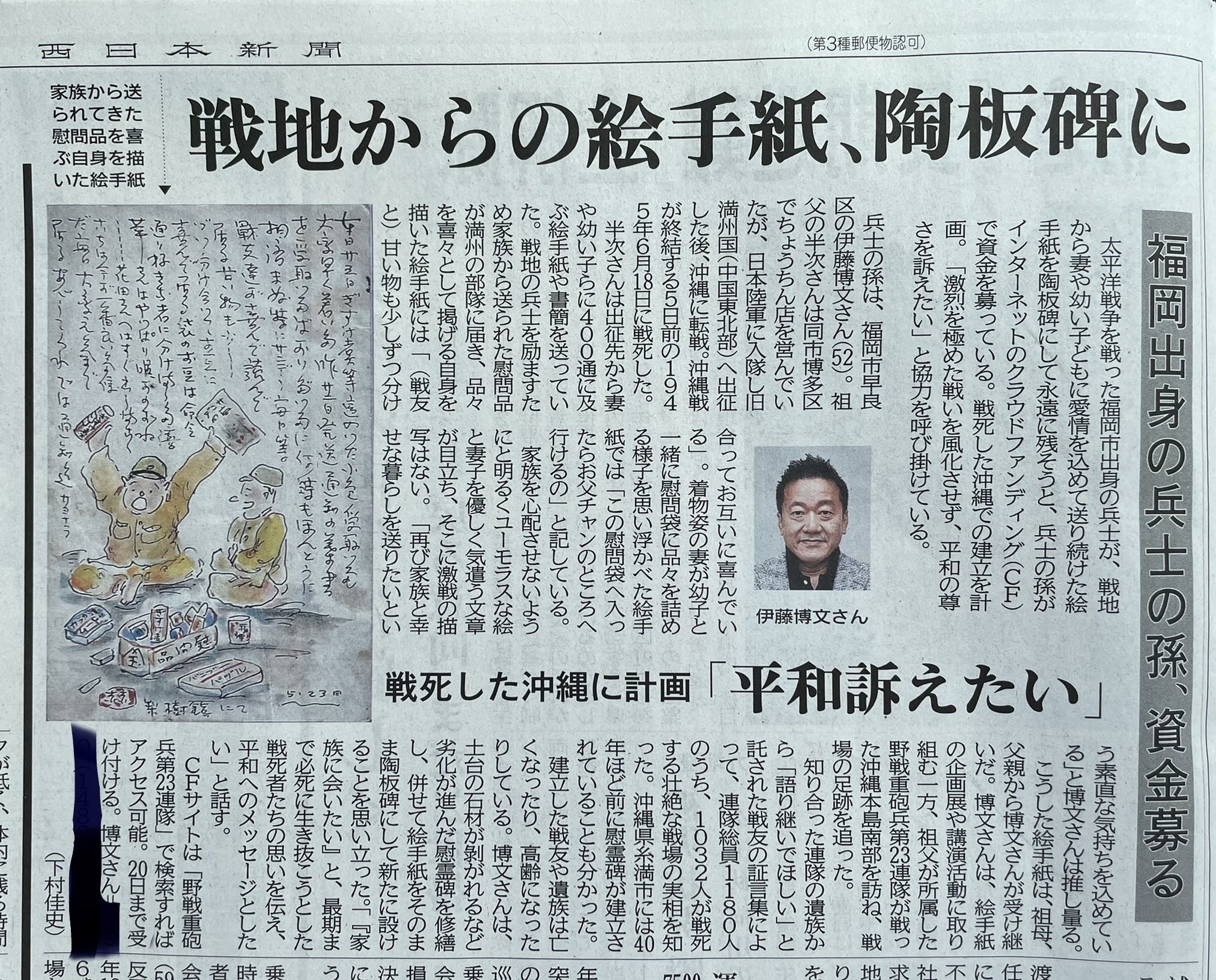 2021/11/19 22:54家族愛に満ちた祖父の絵手紙を陶板碑にして、沖縄戦を戦った野戦重砲兵第23連隊の慰霊碑の場所(沖縄県糸満市)へ。※写真:令和3年11月12日 西日本新聞朝刊(第三社会面) もっと見る