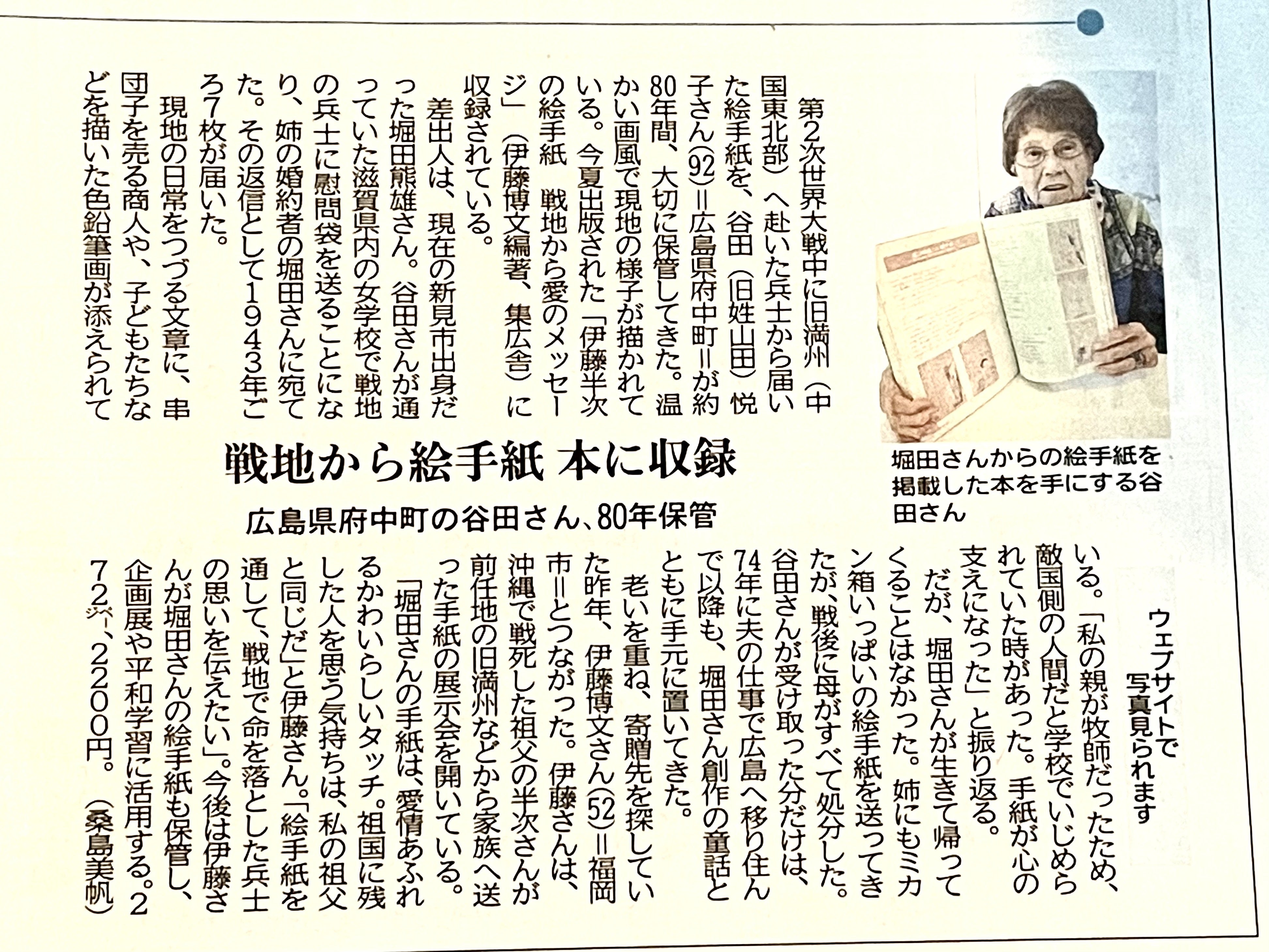 2021/11/19 23:07残り1日となりました!広島県の谷田さんが80年間保管していた絵手紙を「伊藤半次の絵手紙」に収録し、織田廣喜美術館の企画展でも紹介した絵手紙が中国新聞に取り上げられました。祖父の足跡を訪ね、祖父の絵手紙が繋いだご縁です。祖国に大切な人を残して、戦地で散った一人一人の思い!「伊藤半次の絵手紙」には、そんな想いをつなぐ力があります。後世に陶板碑を残せますよう、皆様のお力をいただきますよう何卒よろしくお願いします。中国新聞 ヒロシマ平和メディアセンター記事「もう一つの絵手紙」 もっと見る