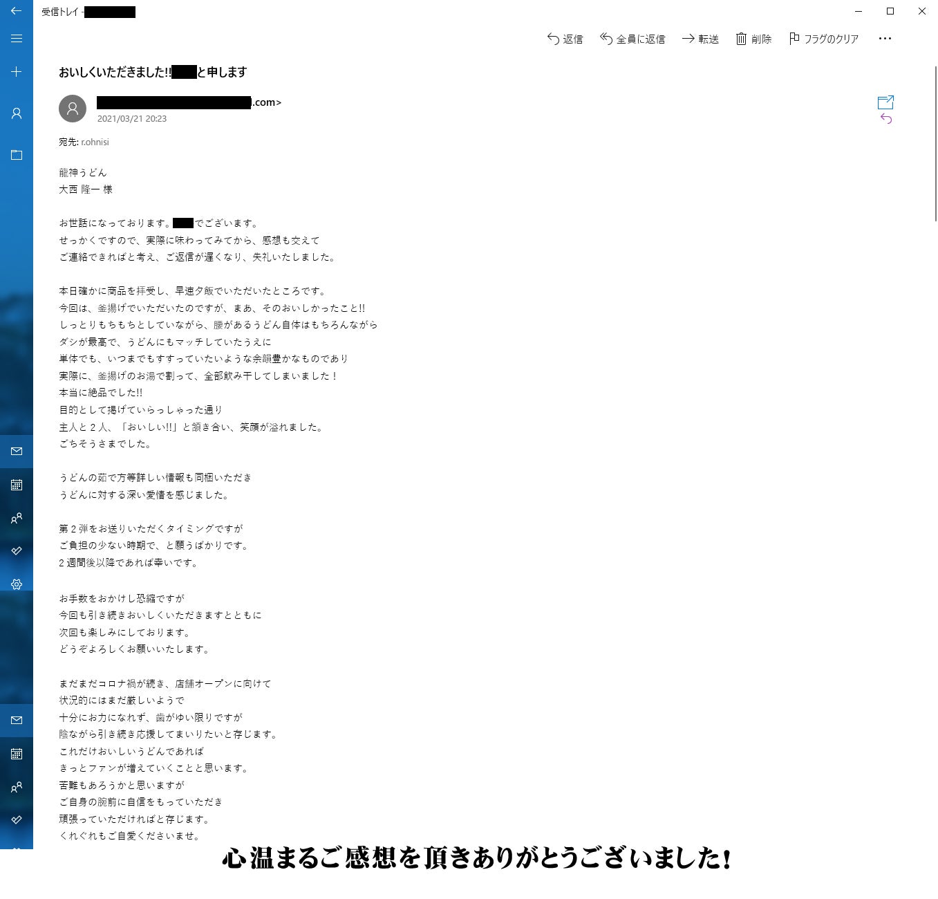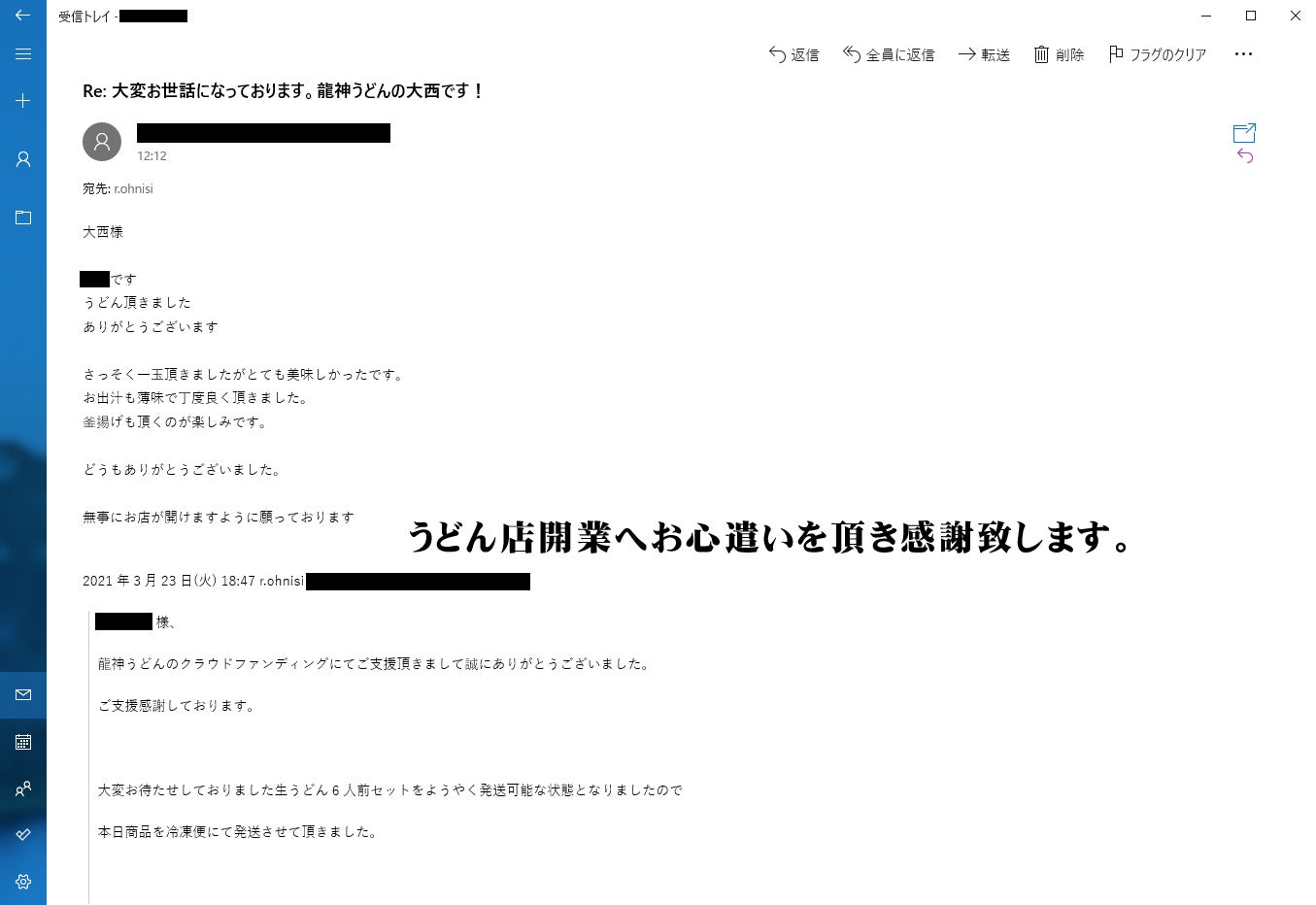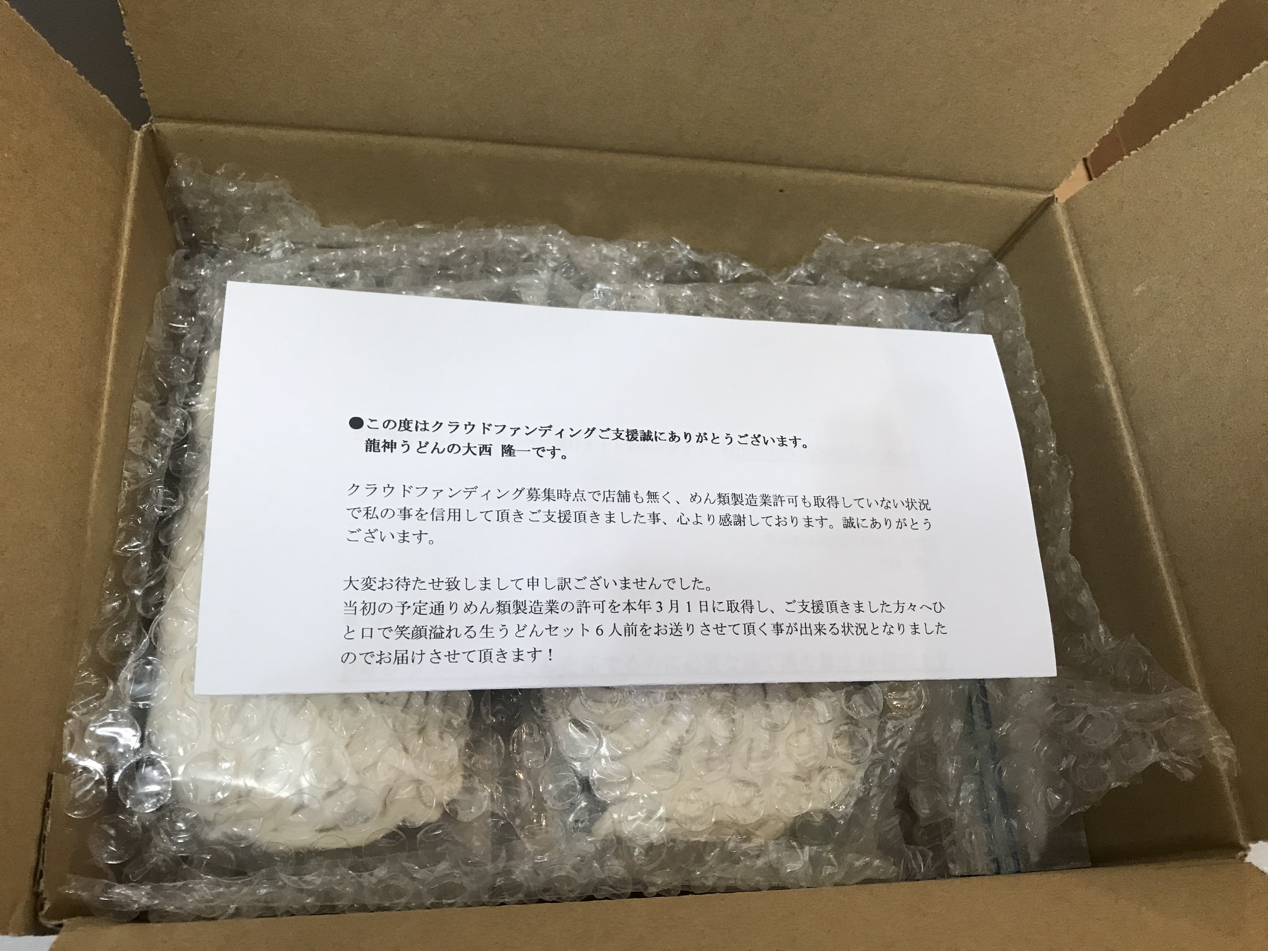 2021年1月にクラウドファンディングにてご支援を募り、41名様の方々が私の為にご支援をして頂き、本当に感謝しております。ご支援の返礼品は当初の予定では開業後5月あたりから返礼品をお送りする予定で募集させて頂きましたが3月に入り、めん類製造業許可を取得致しましたので返礼品発送の予定を早め、41名様すべての方々へ返礼品発送を完了致しました!