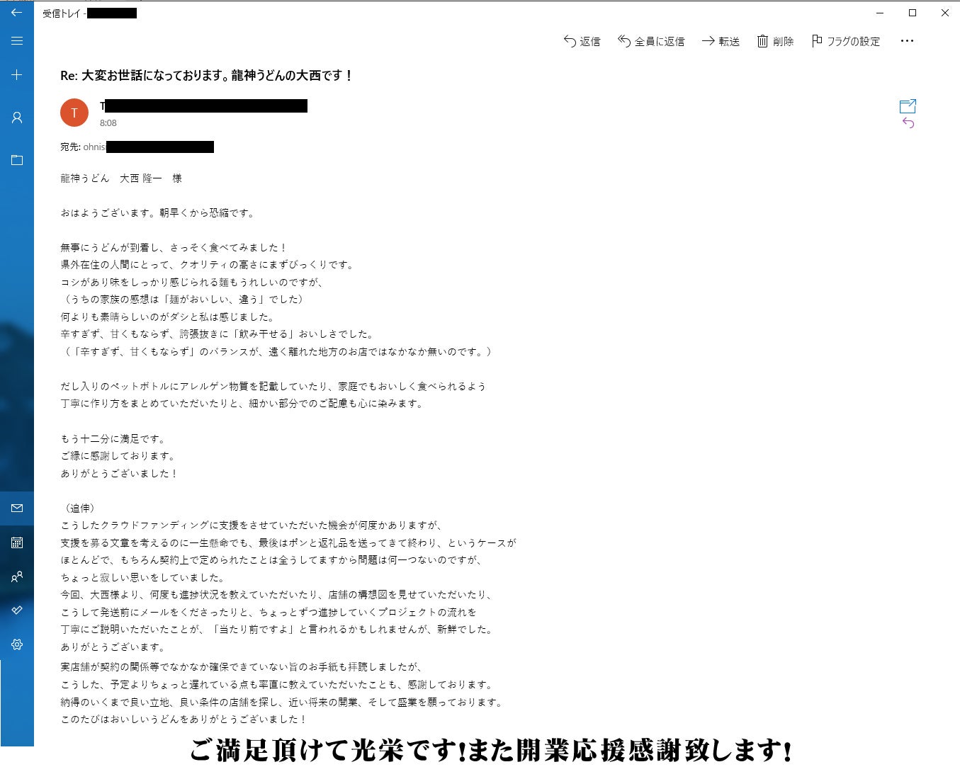 2021/06/05 10:08ご支援頂きました皆様、おはようございます!活動報告が出来ず誠に申し訳ございませんでした。まずは6月2日に予定通りOPEN出来ました事、皆様に御礼を申し上げます。誠にありがとうございました。ご提供させて頂いておりますうどんは確かに反響も良く大変喜んで頂ける方々を多く見かけますが、その反面コロナ禍という事で、今回出店した場所が市役所から徒歩1分の距離ですので現在はお役所努めの皆様も密をさけるという意味で店舗にほとんど入ってきて頂けません。その為、当初予定しておりました来客人数を大きく下回り6月2日30名程度、3日50名程度、4日30名程度というように、1日120人程度の来客数を見込んでおりましたが3分の1程度となっております。私も脚が非常に悪い中、出来る限りの努力を続け、毎日100名程度の来客を見込みうどんの仕込み、出汁の仕込みを行っていましたがほとんどロスとなってしまい毎日赤字経営の状態が続いているというのが現状です。このままでは運転資金が1・2ヵ月で底をついてしまい非常事態宣言が明ける頃には経営自体が危ない状態となっております。予定していたご支援頂きました方々への生うどん返礼の発送は体力的にすぐには発送出来る状況ではありませんが、こちらに関しては仮に閉店したとしても必ず発送はさせて頂きますが、それ以前に店舗がつぶれないようにコロナに耐えられる運転資金を確保し、日々の業務を継続していきたいと考えております。返礼品に関しましては誠にお待たせして申し訳ございませんが必ず発送はさせて頂きますのでもう少しお時間を私に下さい。自分で現在確保出来ている運転資金は微々たるものですので違った形にて再度クラウドファンディングにてご支援を広く募らせて頂きたいと考えております。もしお力添えを頂けますと幸いではございますが、今回のご支援頂きました返礼品が遅れてしまう事ご了承頂きたく活動報告に記載させて頂きました。今後も自分に出来る限りの努力をしてお店を守り、繁盛させていきたいと思っておりますのでご理解の程宜しくお願い申し上げます。かんたんではございますが活動報告とさせて頂きます。皆様、誠にありがとうございます。龍神うどん 店主 大西 隆一店舗が継続出来るように努力は行っております。うどん小1杯100円のプレオープンの際には多くの方々が見えられました。 もっと見る