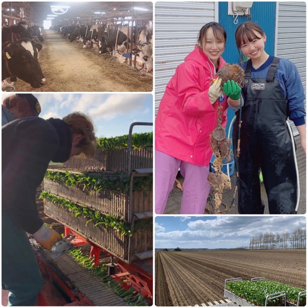 写真:左上)搾乳、右上)ホタテ、左下・右下)農業