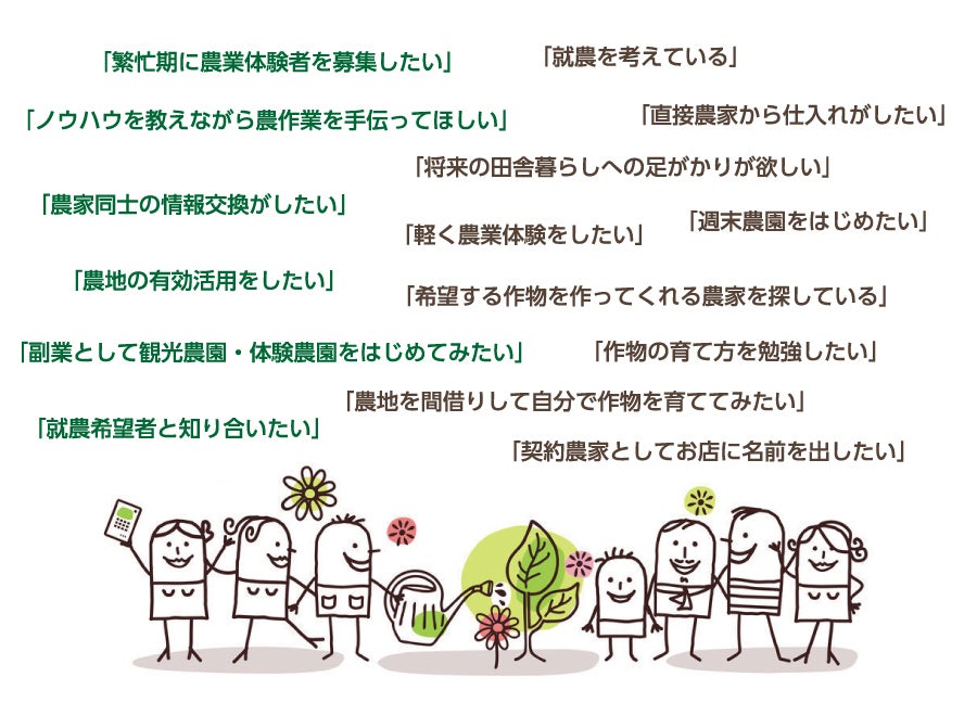 農家が抱える問題や不安は各々の状況で様々であり、企業や人々が農家に求める期待も様々です。お互の希望により近い相手にめぐりあえれば、将来の選択肢もお互いに増やせるでしょう。