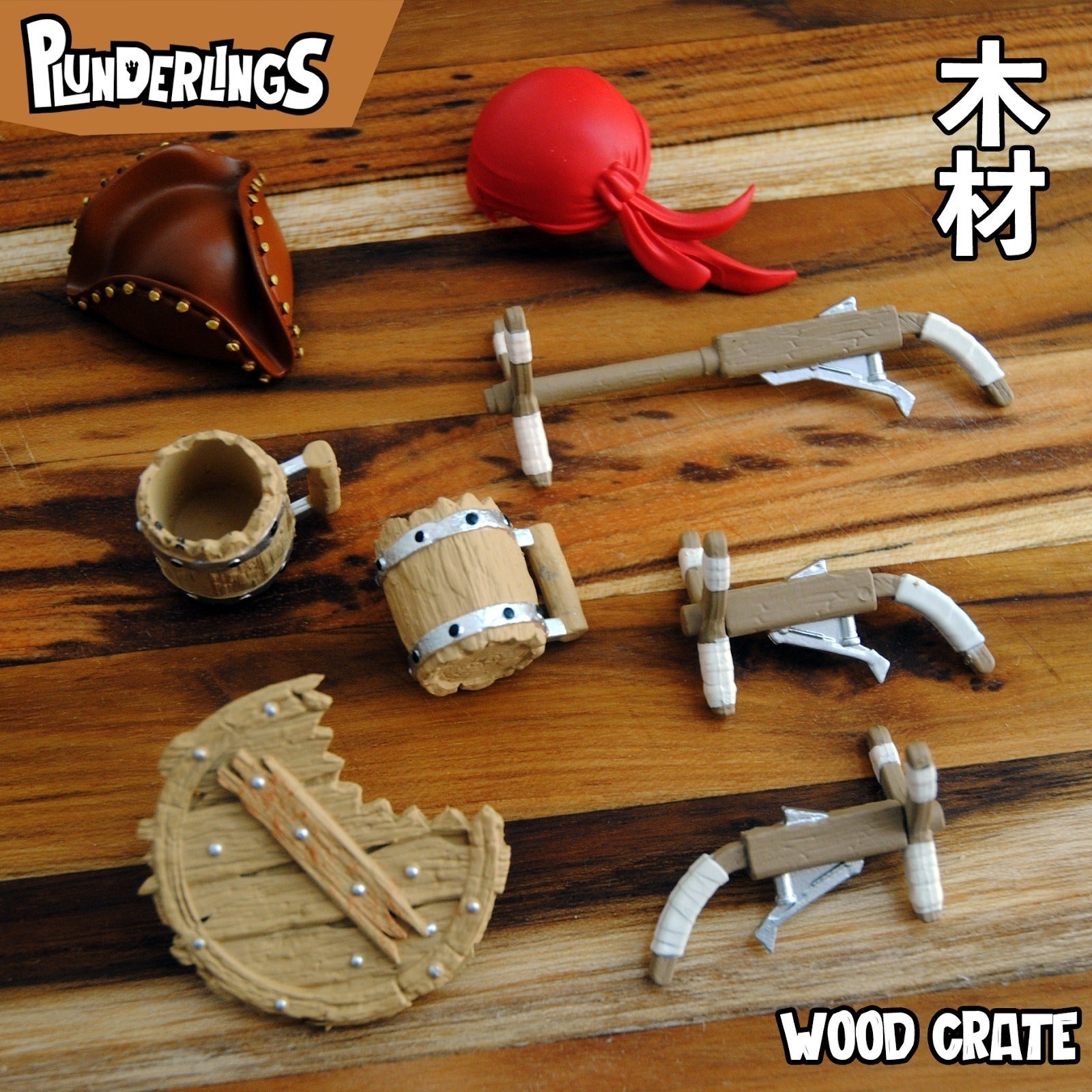 あなたのPlunderlingsのチームは海賊になることを夢みていますか?海賊になるためには、木材のアクセサリーの入っている木の箱がその夢をかなえます!木の箱には、スリングショットピストルが2つ、木製マグカップ2つ、帽子2つ(三角帽子1つ、バンダナ1つ)、長いスリングショットライフルが1つ、戦闘で損傷した大きな盾(ダメージ加工)が1つ含まれています。