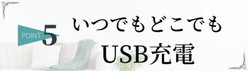 USB充電なのでPCやモバイルバッテリーがあれば、場所を選ばずいつでも、どこでも充電が可能です。