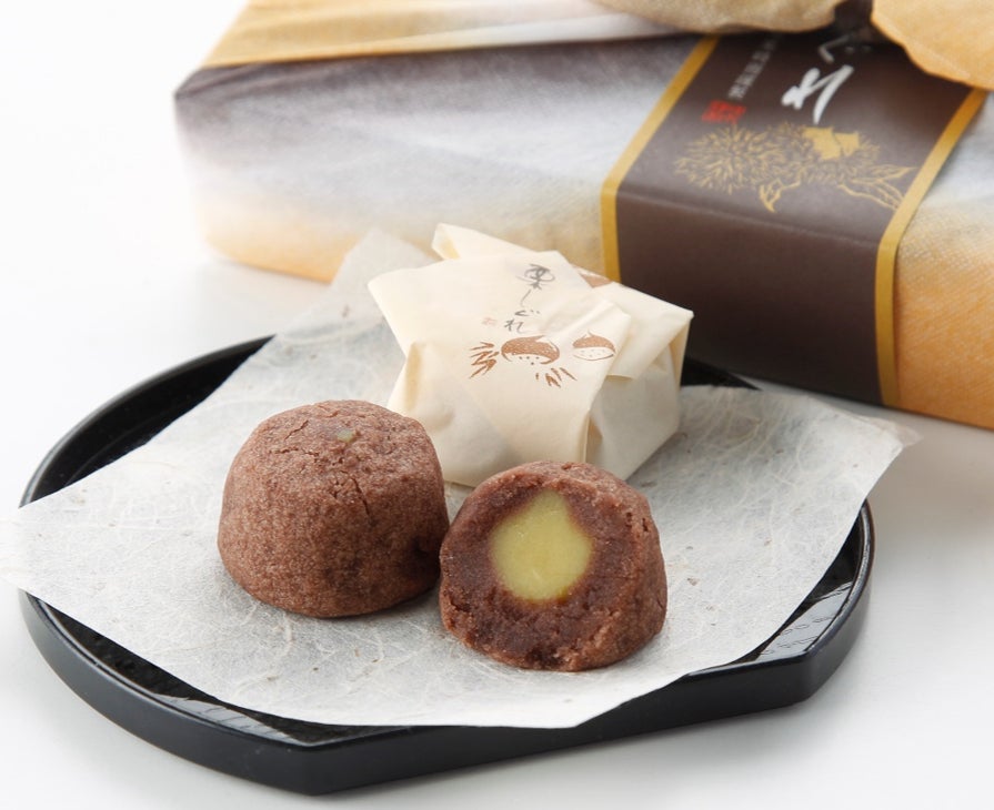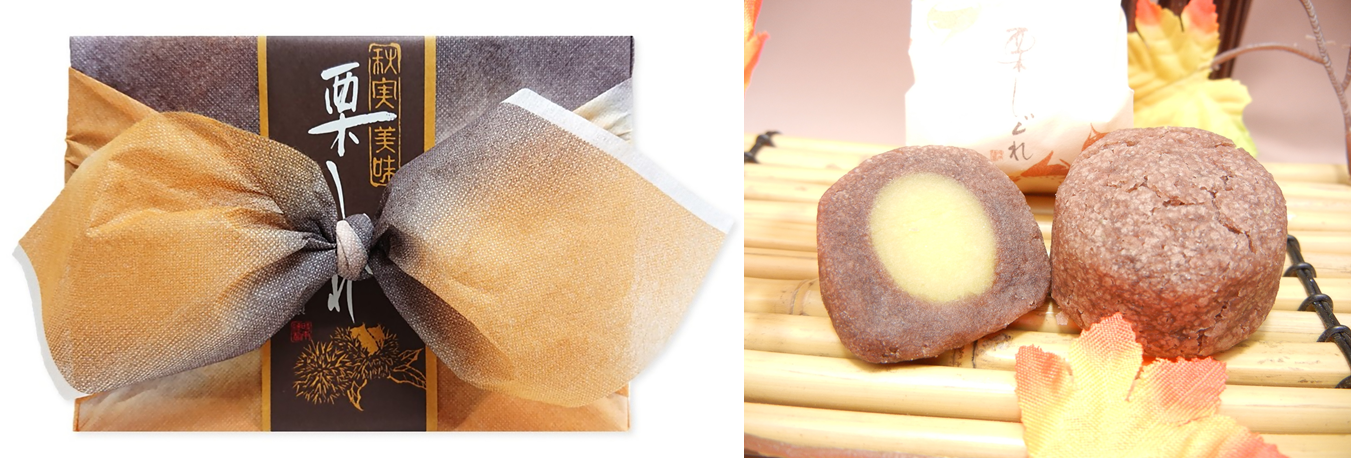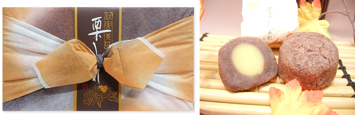 栗しぐれ・・・【栗餡】を【こしあん】で包み込んだ、しっとりとしたしぐれ菓子です。