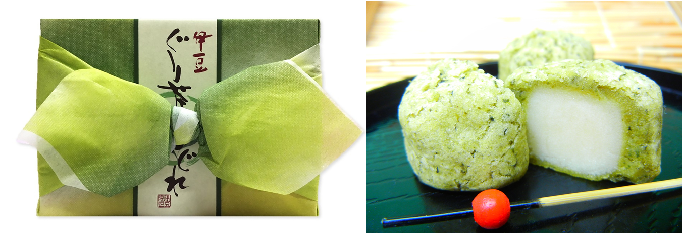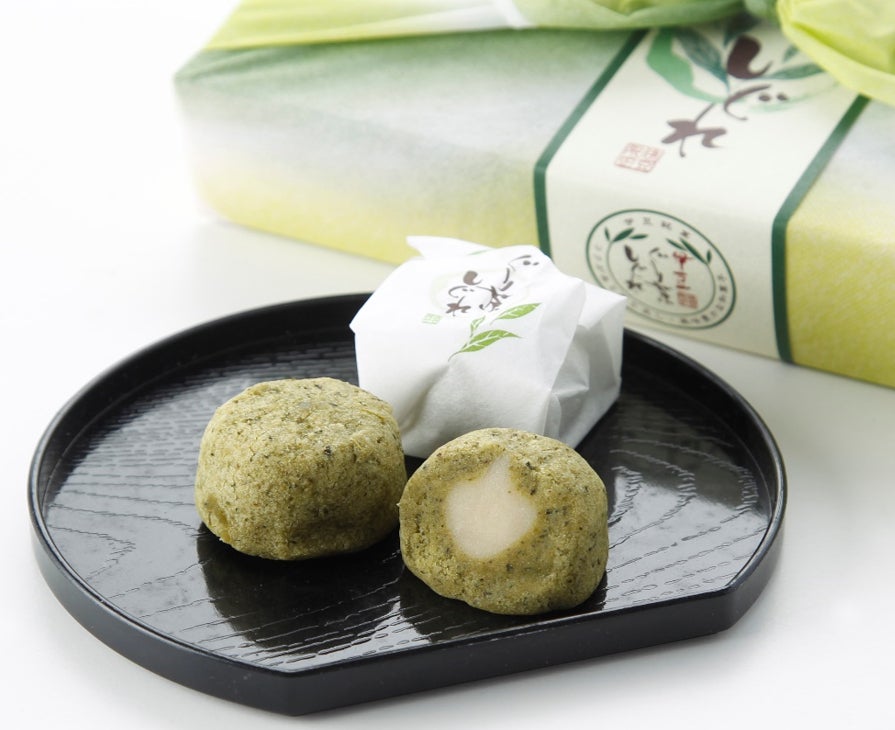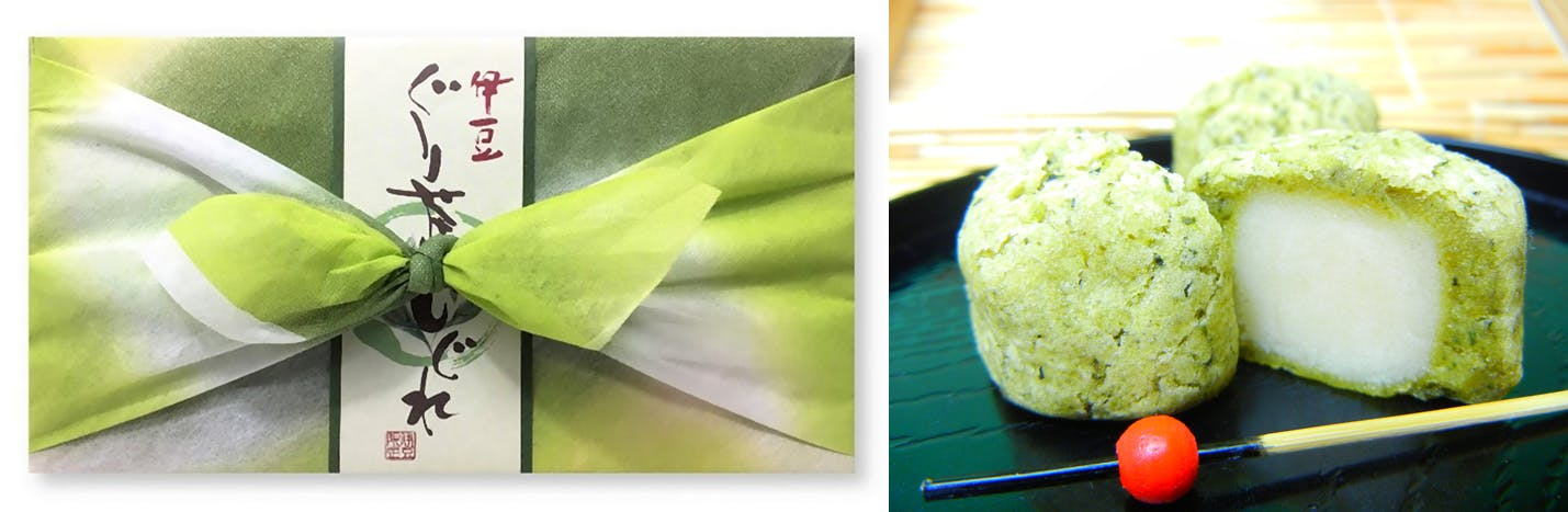 ぐり茶しぐれ・・・外餡に伊豆【ぐり茶】を使用し、中には白餡を優しく包み込んだ香り豊かで滑らかなくちどけの、しっとりとしたしぐれ菓子です。地元の伊東ブランド「いとうのいいもの」認定商品です!