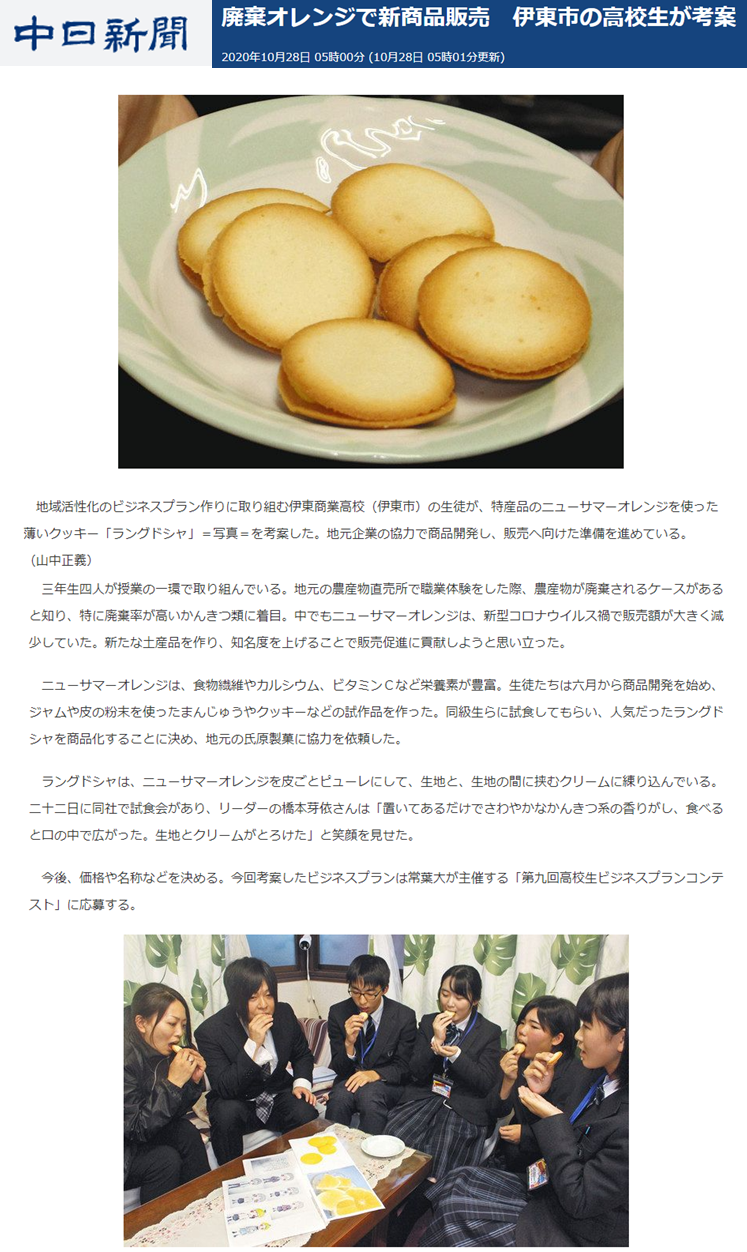 中日新聞・東京新聞【廃棄オレンジで新商品販売 伊東市の高校生が考案】。