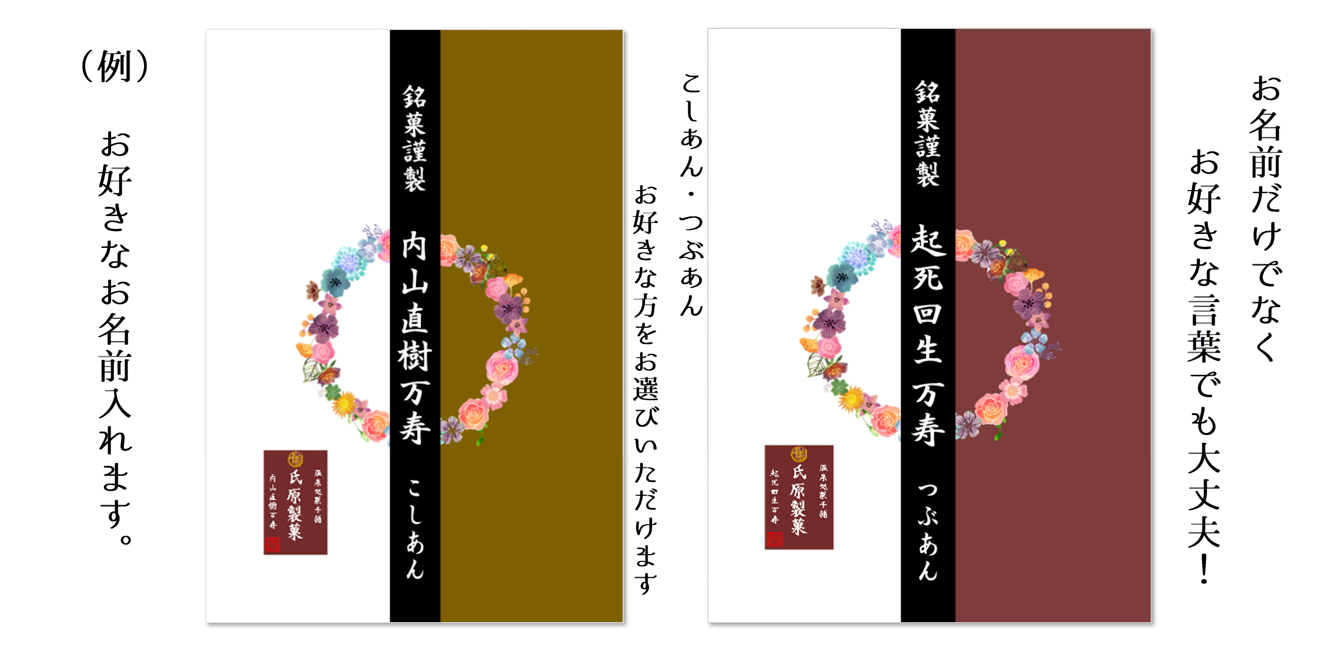 備考欄に【こしあん・つぶあん】、入れたい文字をご入力お願いいたします。