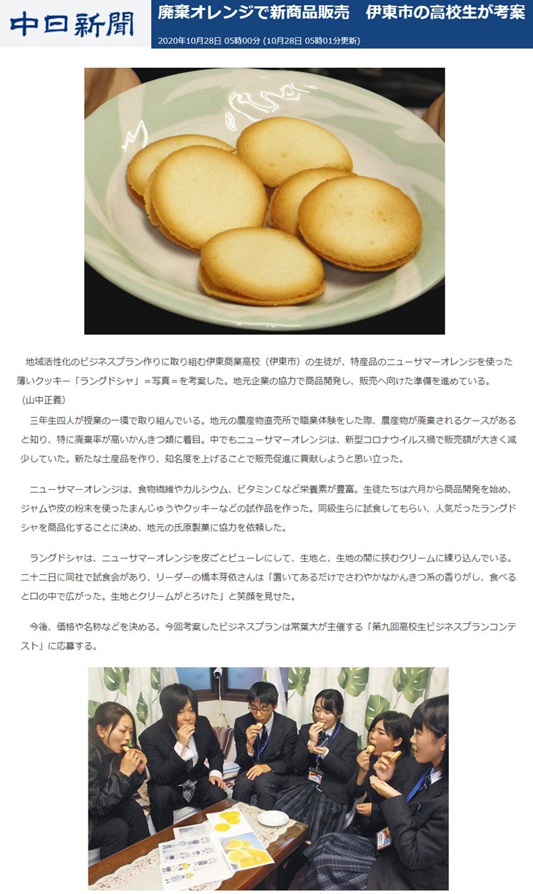 2020年10月24日 静岡新聞【特産ニューサマーオレンジでラングドシャ 伊東商高生が考案】