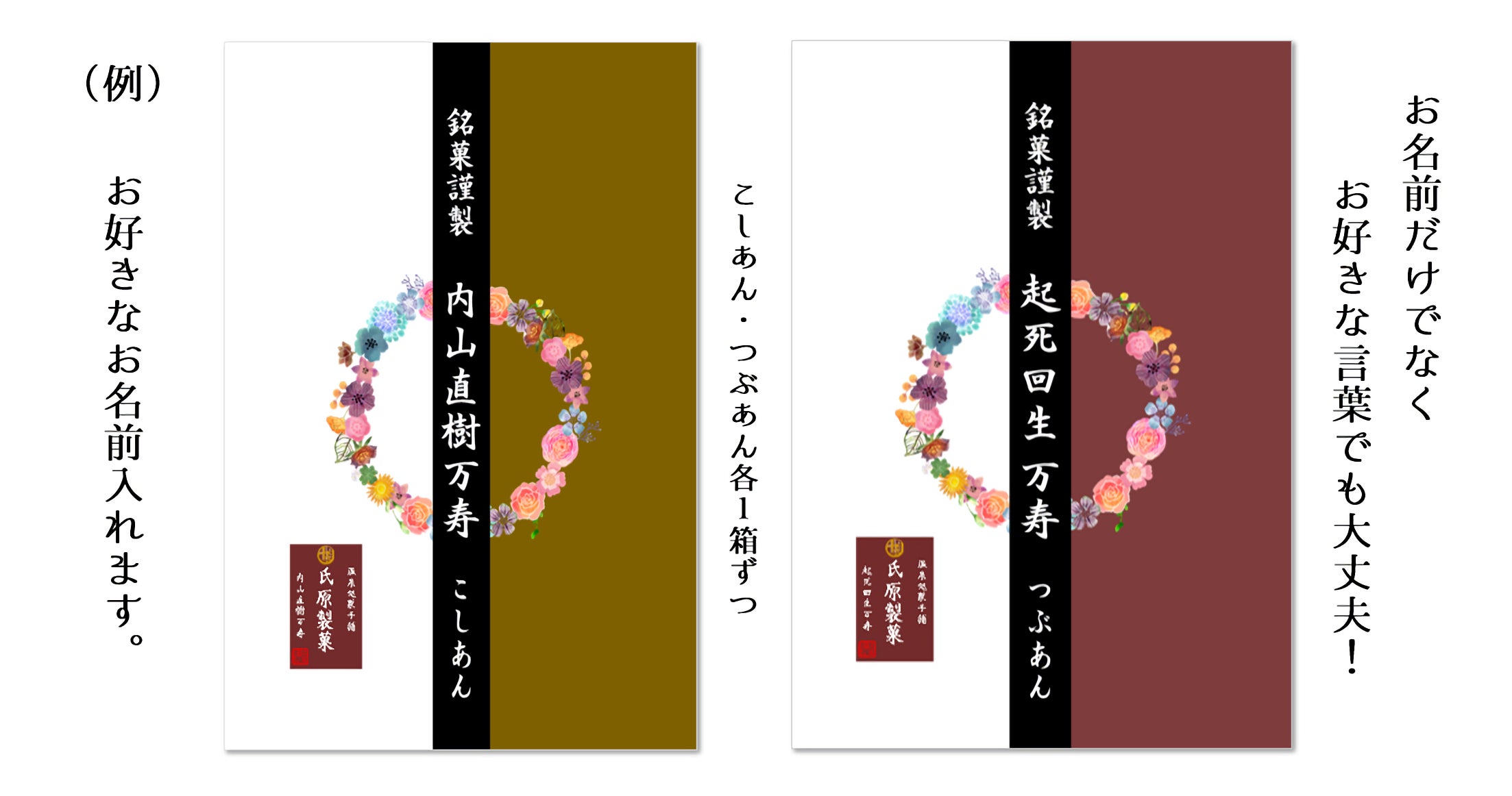 世界に一つ⁉あなただけのオリジナルパッケージ饅頭(万寿)こしあんとつぶあん各1箱ずつ、
