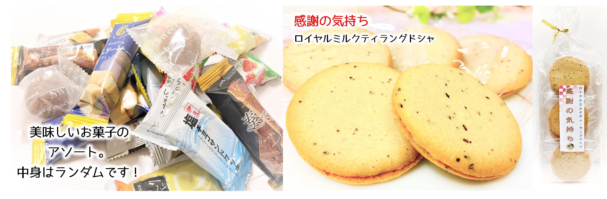 6000円相当のバラエティ菓子150個、感謝の気持ち(ロイヤルミルクティラングドシャ)10枚を