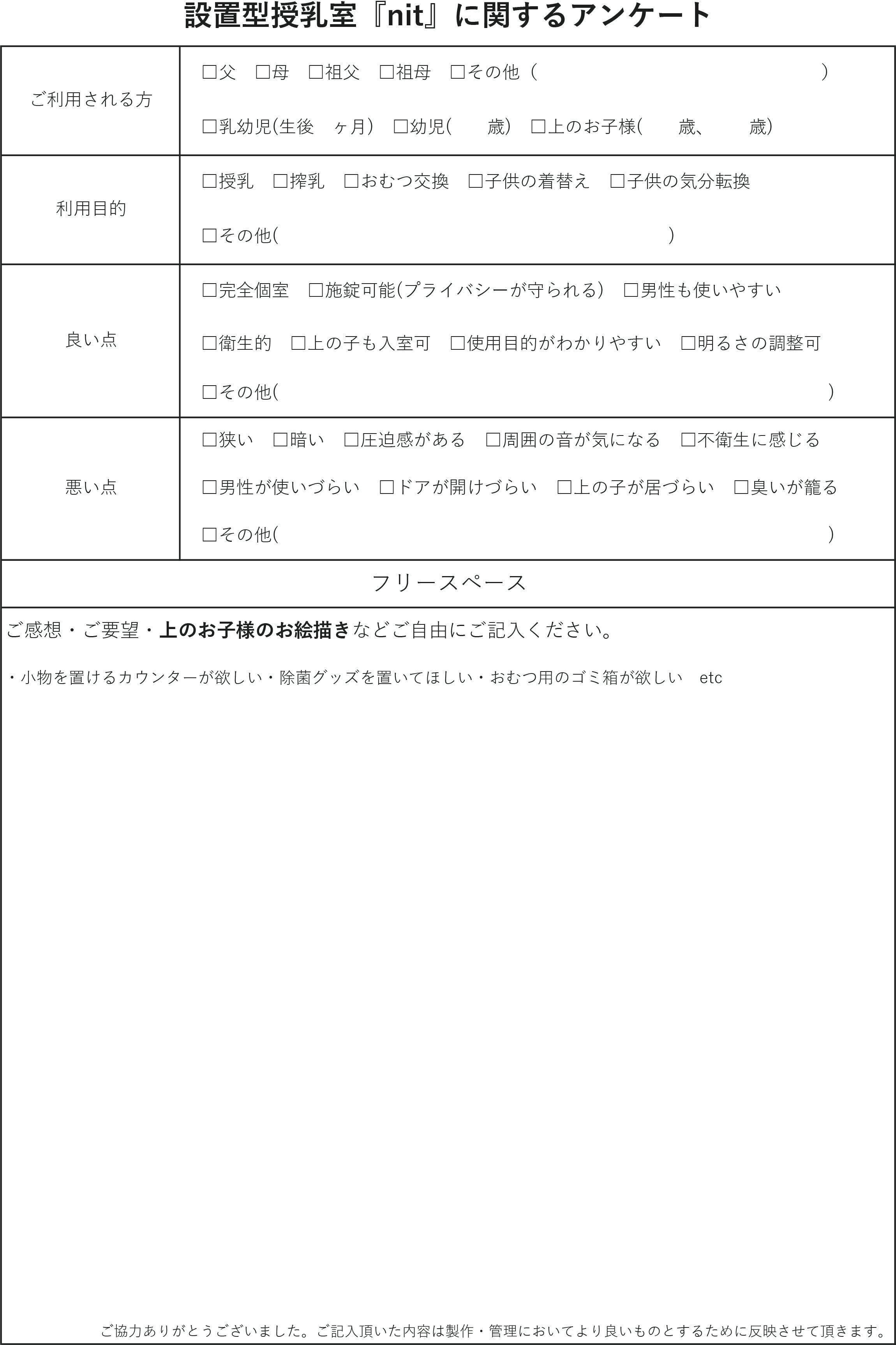 ご利用者様のご意見を頂けるよう、アンケート用紙を作成しました。