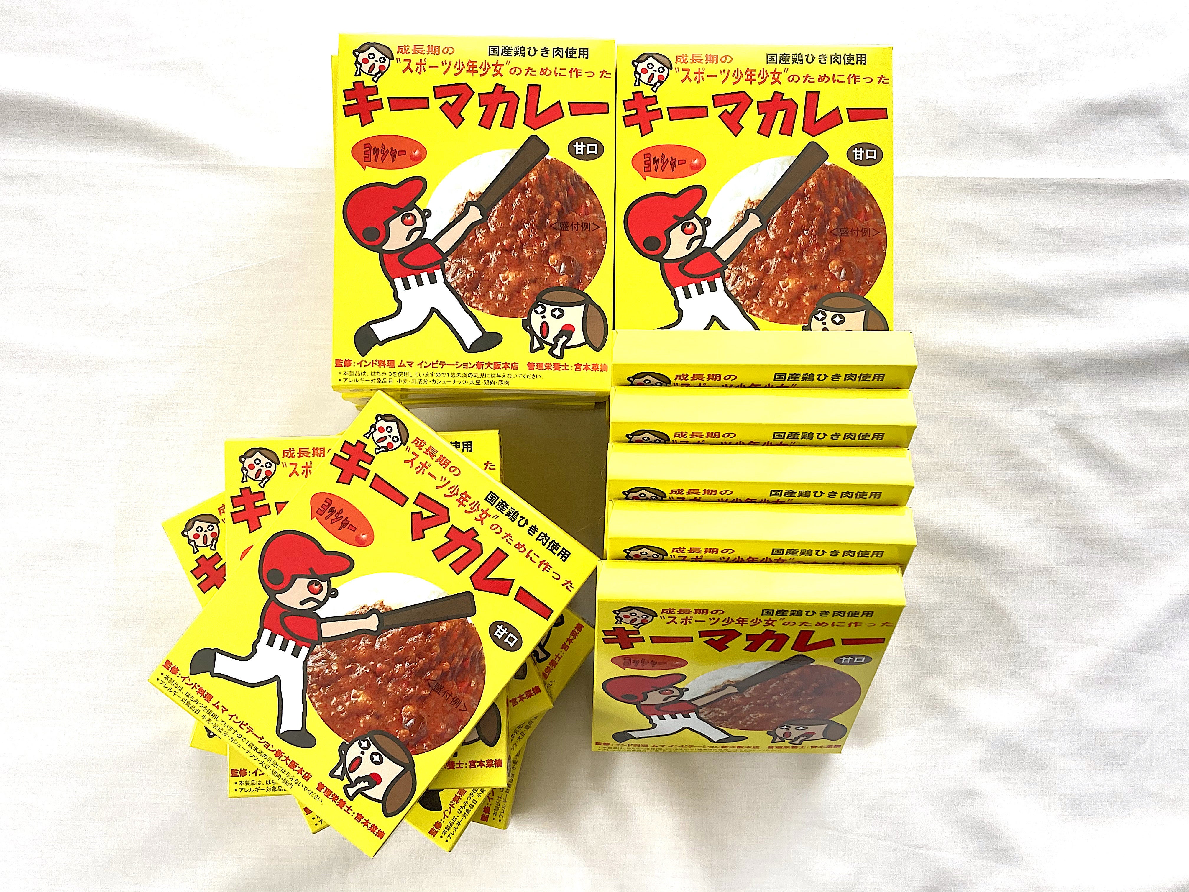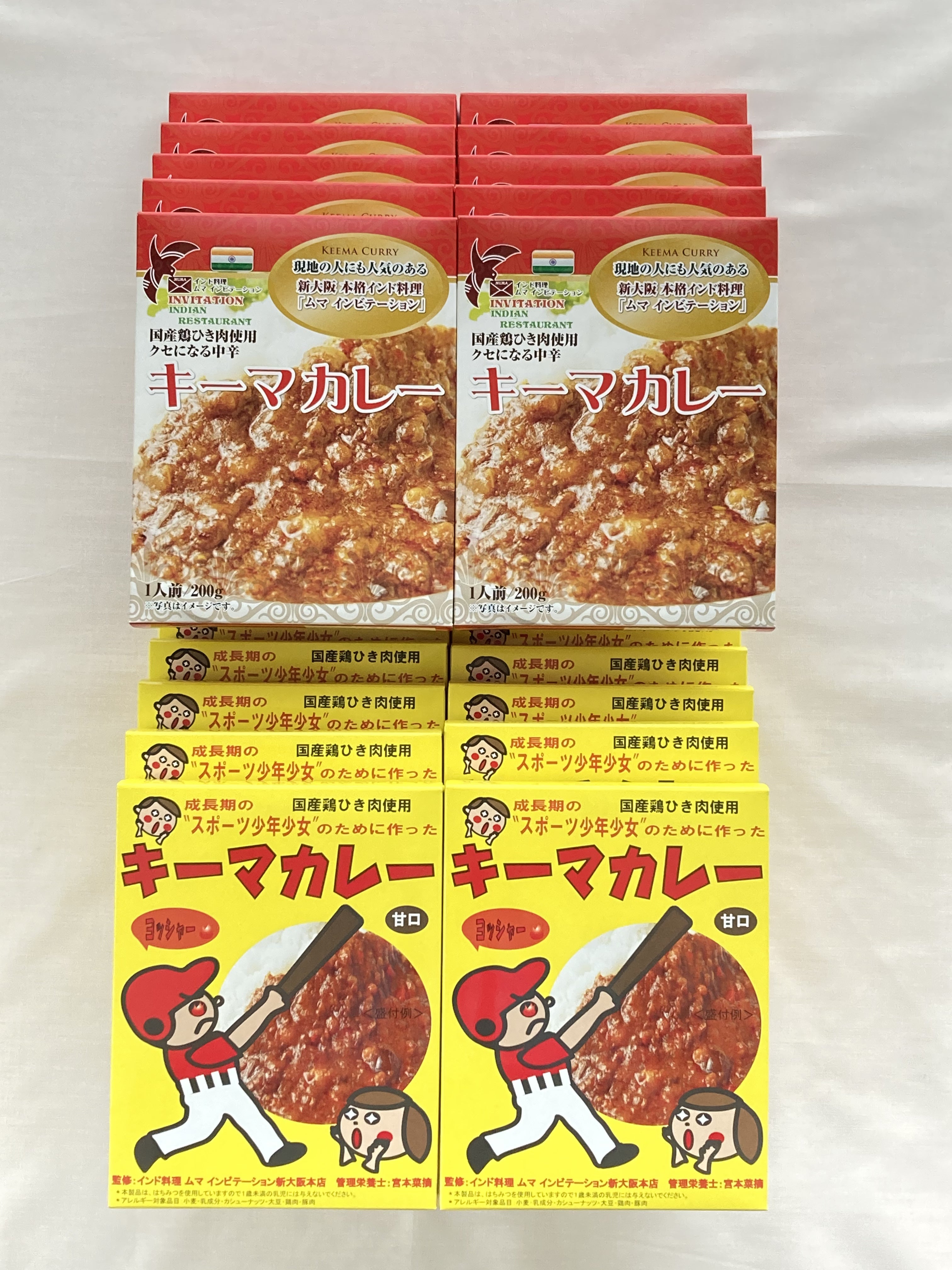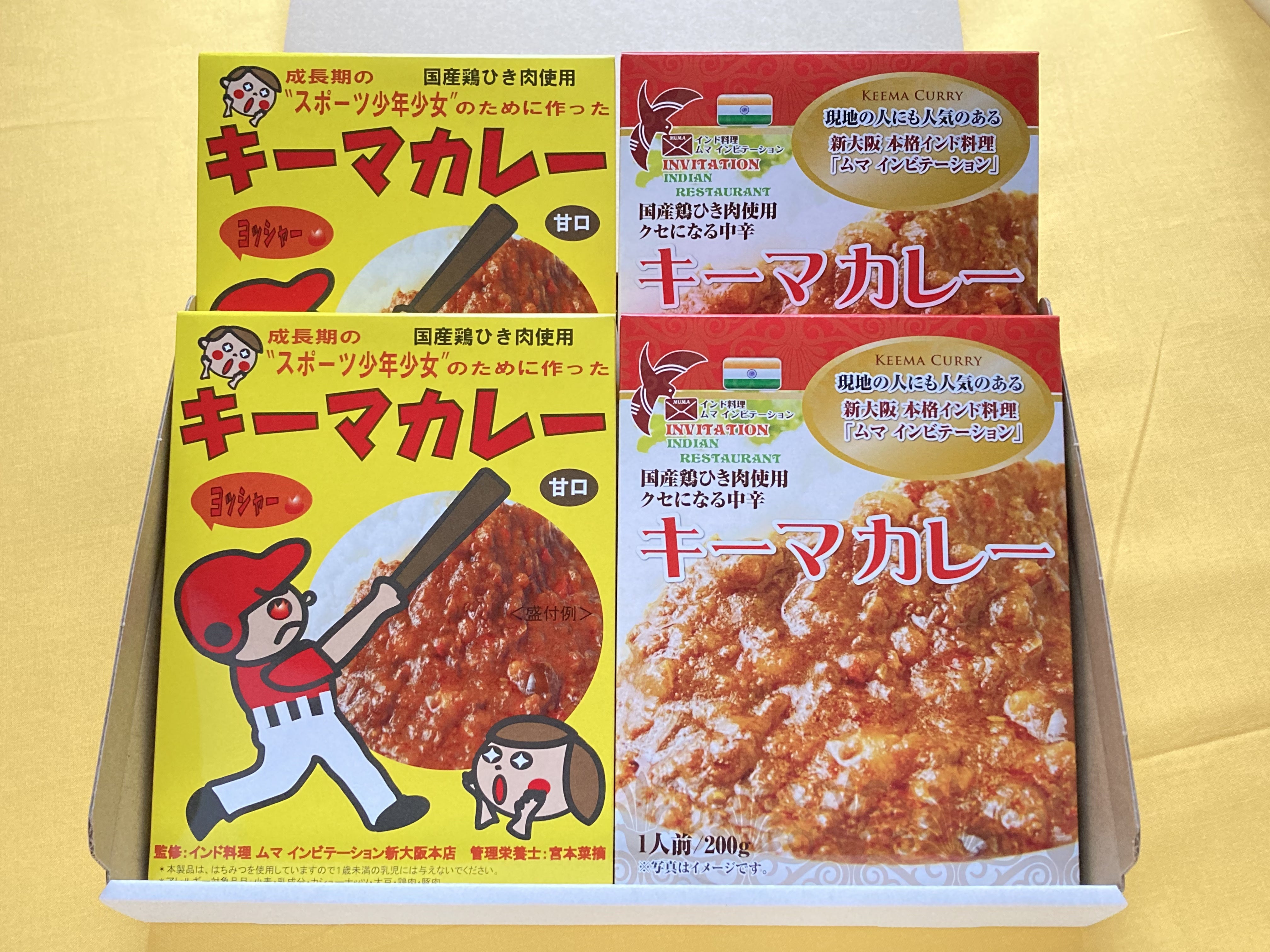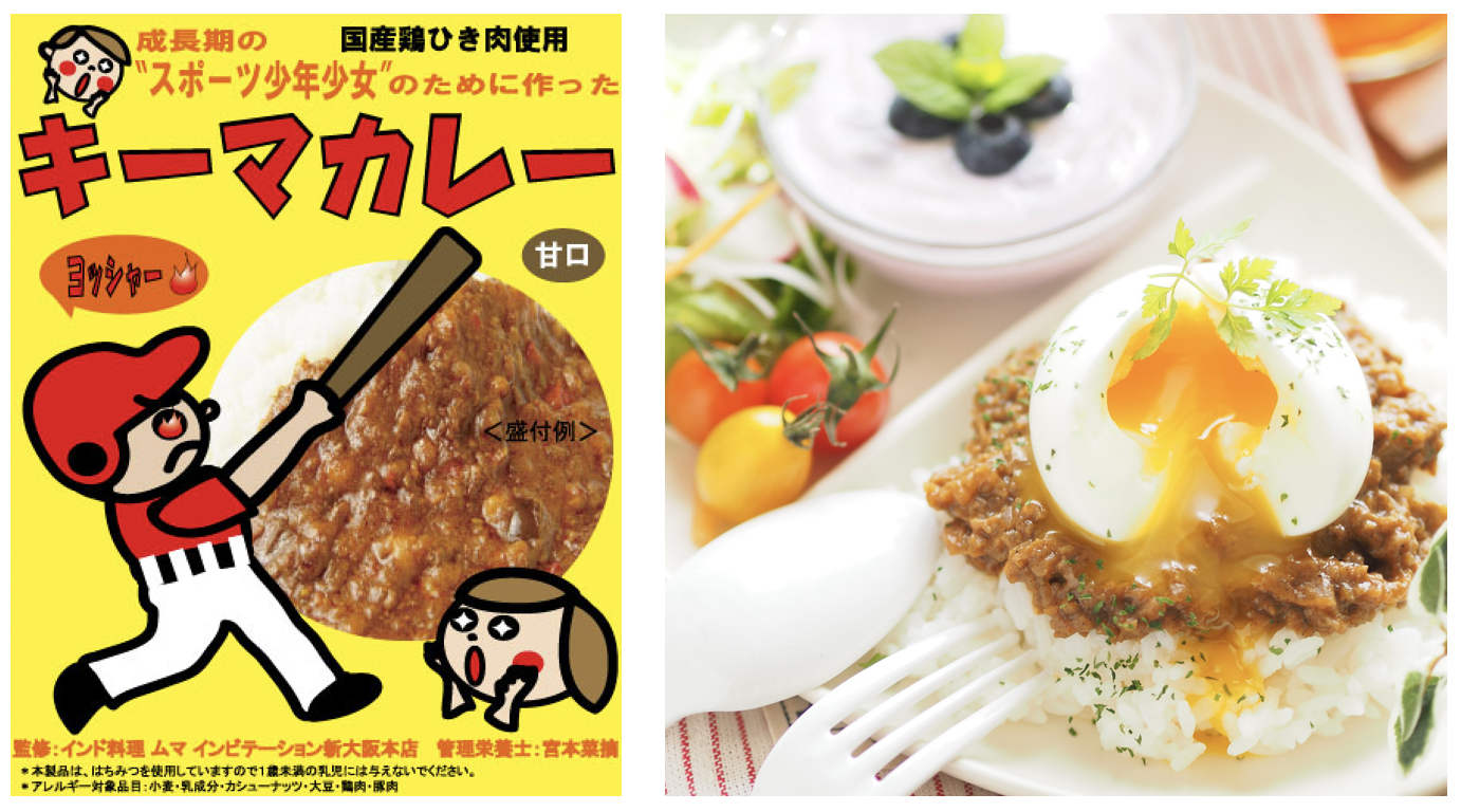 お届けするレトルトカレーは、国産鶏ひき肉とスパイスをふんだんに使った本格インド料理店「ムマ インビテーション新大阪店」監修の辛さを堪能できる「中辛キーマカレー」と、管理栄養士も一緒に監修したお子様用・スポーツ少年少女のために作った「甘口キーマカレー」です。