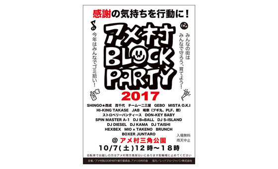 「感謝の気持ちを行動に!」をキーワードに、アメリカ村という街が抱える課題を解決するためにアーティスト、ミュージシャン、ダンサーたちが地元商店街と協働で、それぞれの視点でメッセージを発信し、それを実際の行動に繋げていくためのイベント、「アメ村BLOCK PARTY」を開催します。