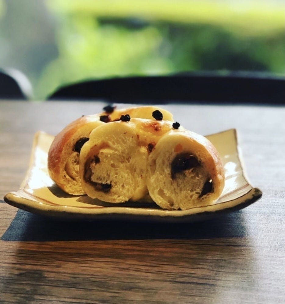 (コーヒー生地にラムレーズンとホワイトチョコを巻き込みました)