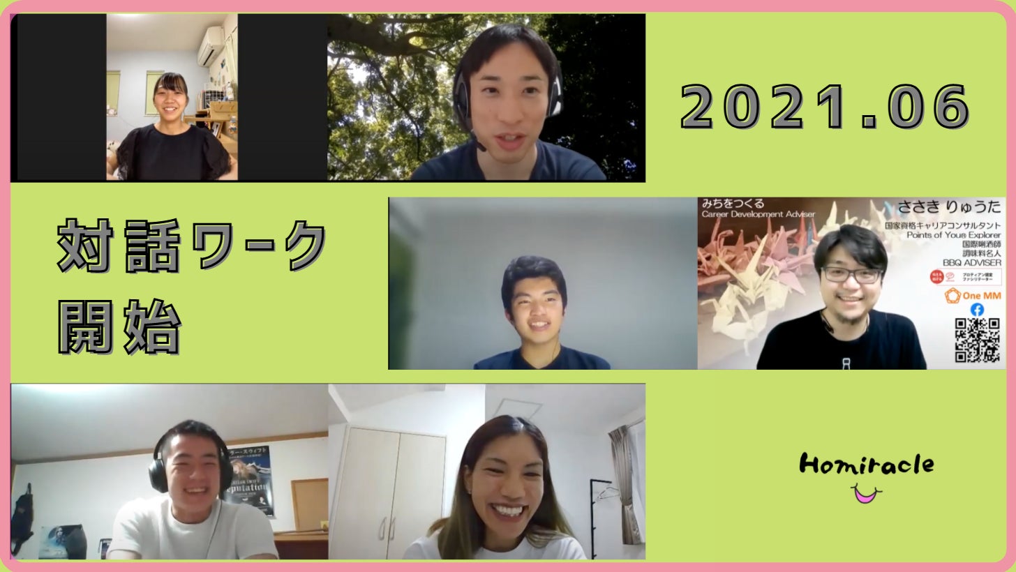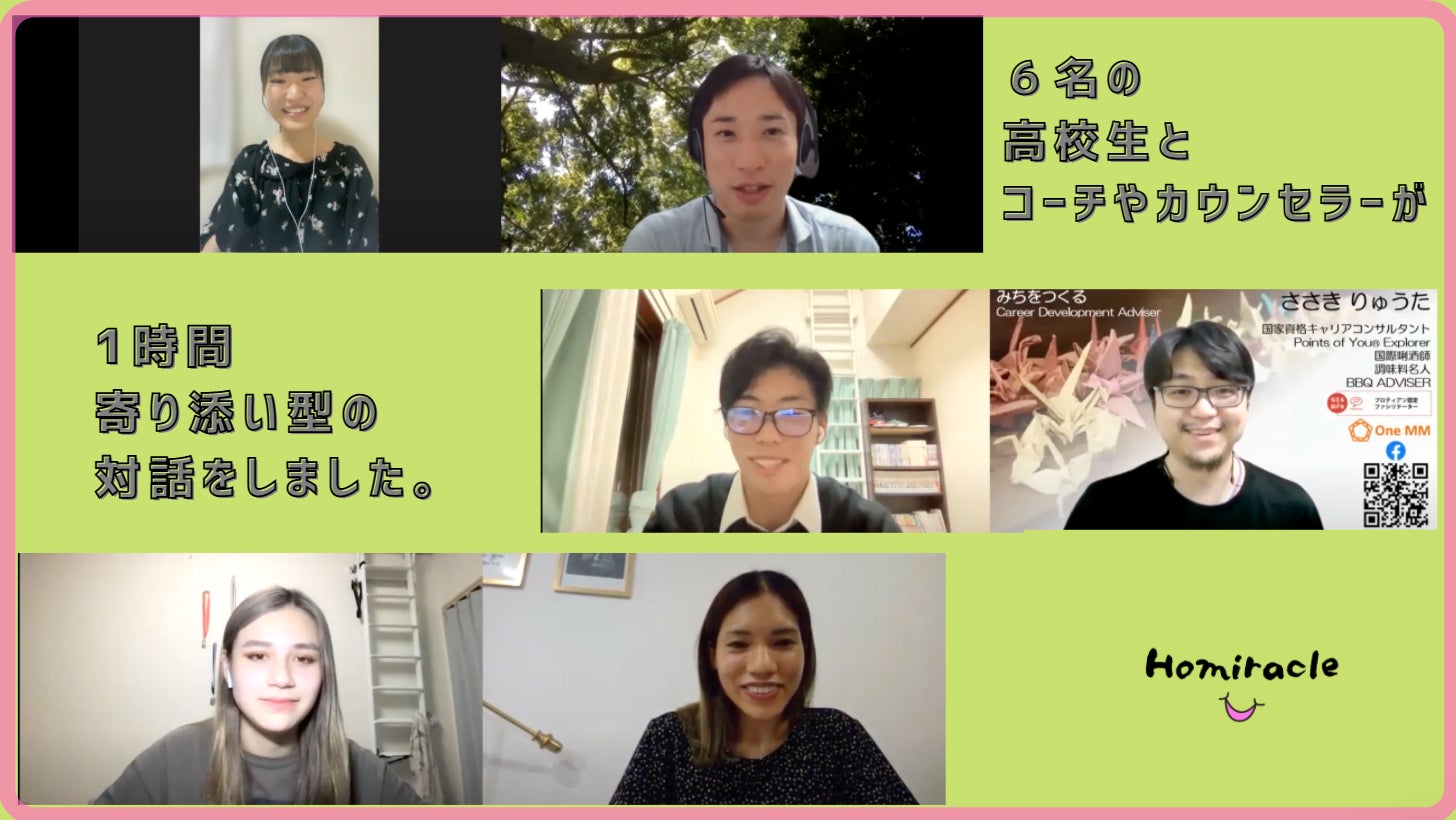 6月に開始し、高校生6名がプロのコーチやキャリアカウンセラーと1対1で1時間、対話をしました。高校生からは、『自分の口からスラスラ言葉が出てくるのが不思議だった!』『自分を見つめ直すいいきっかけになりました』などという言葉を、頂きました。運営一同、初めてお客様にHomiracleを届け、前向きな感想を頂けたことを非常に嬉しく、ありがたく思っています!!