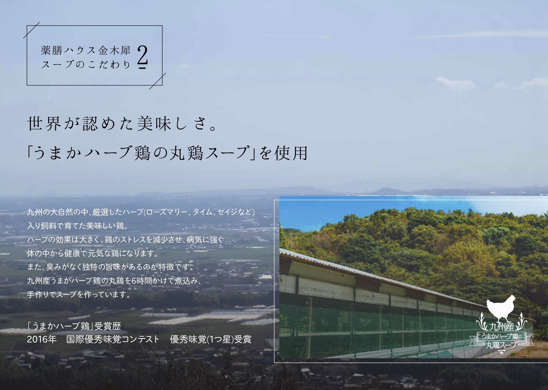基本となる丸鶏スープは、ハーブを混ぜた飼料で育てられた(株)熊本チキンのハーブ鶏を使っています。ローズマリーやセルフィーユなど西洋のハーブと薬膳との画期的なコラボレーションです。