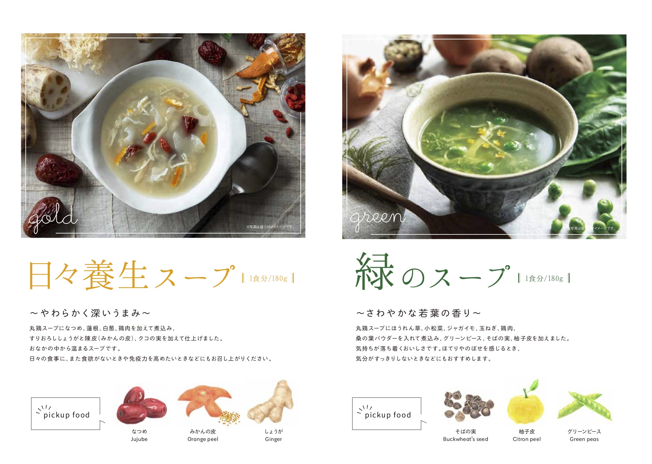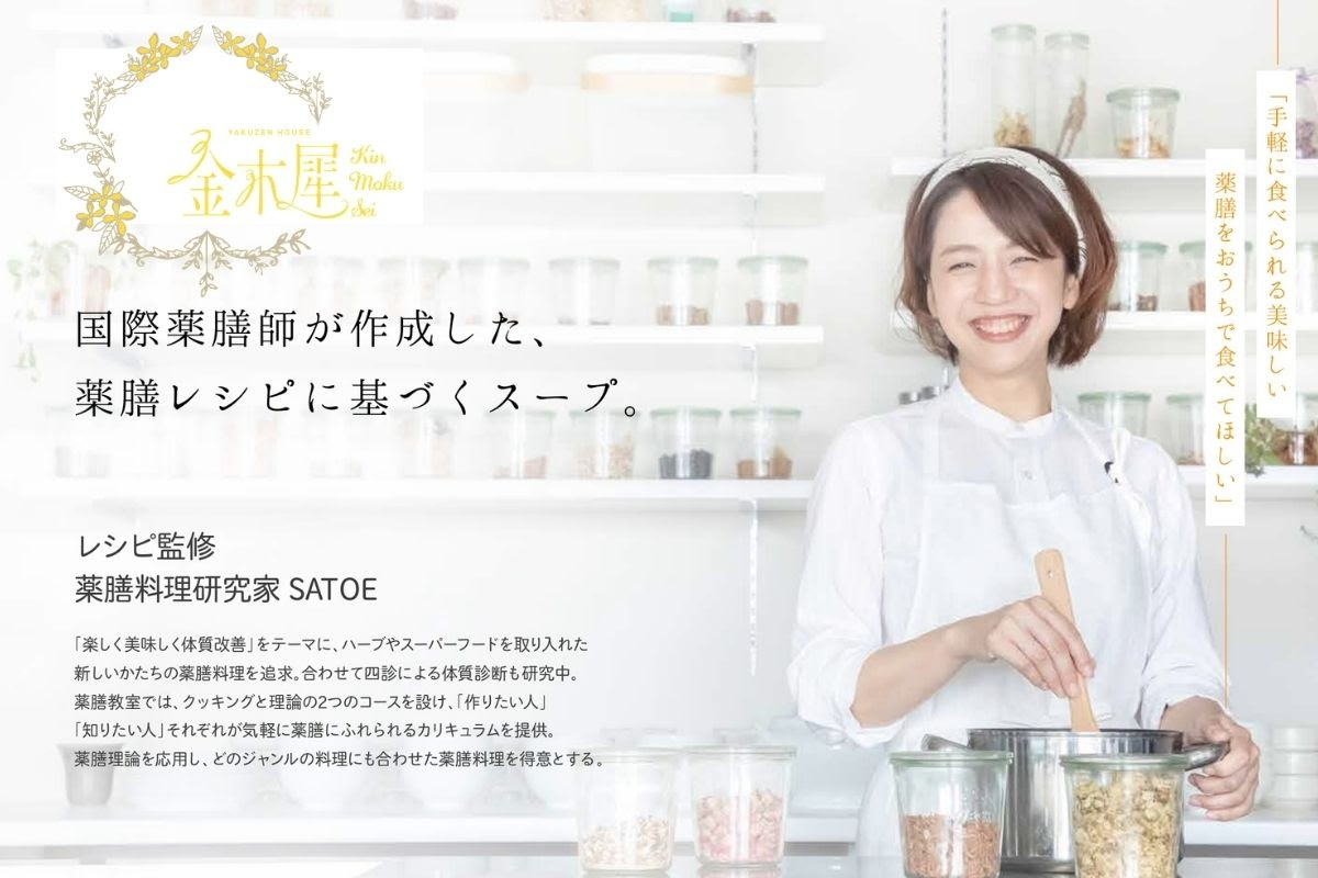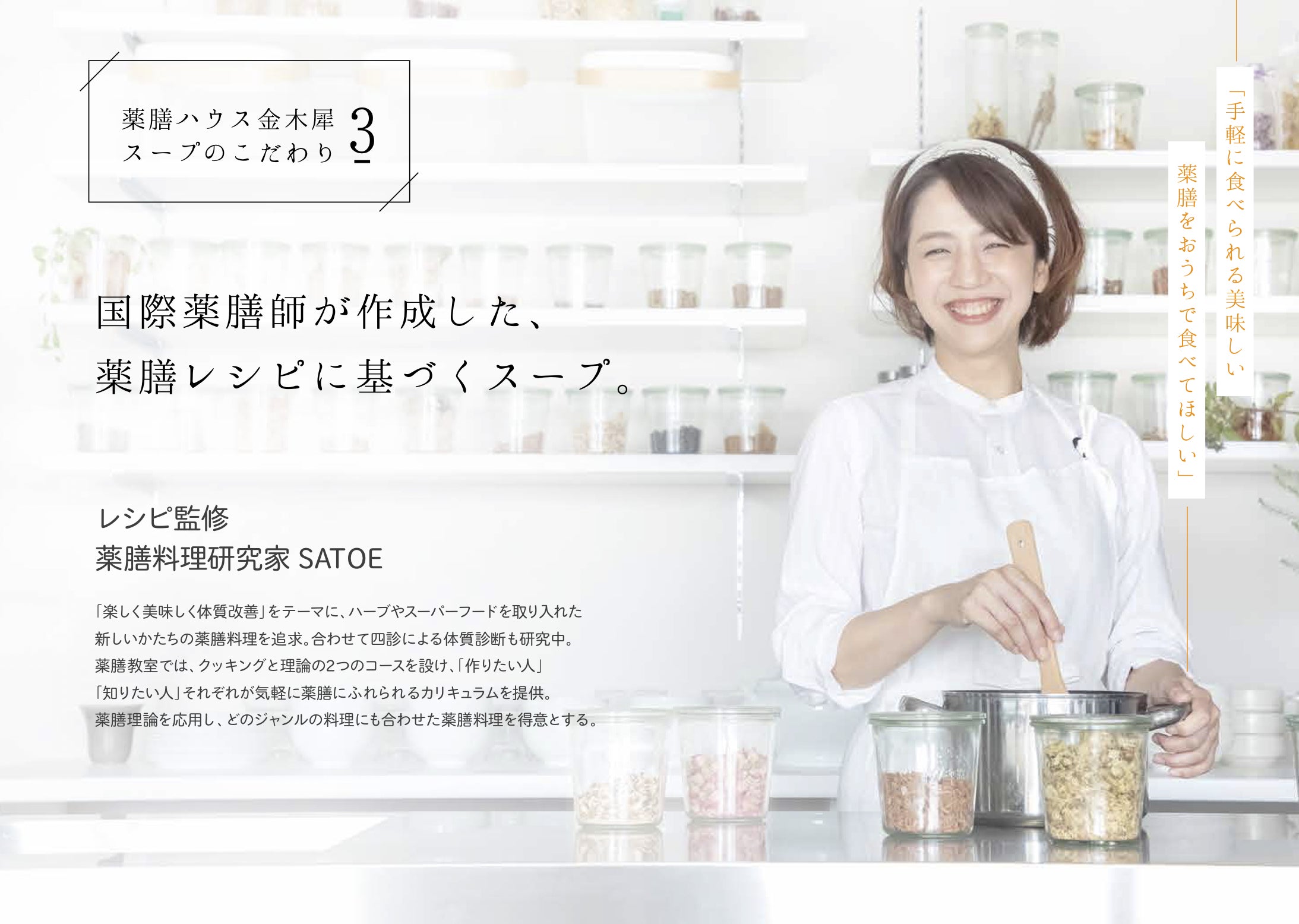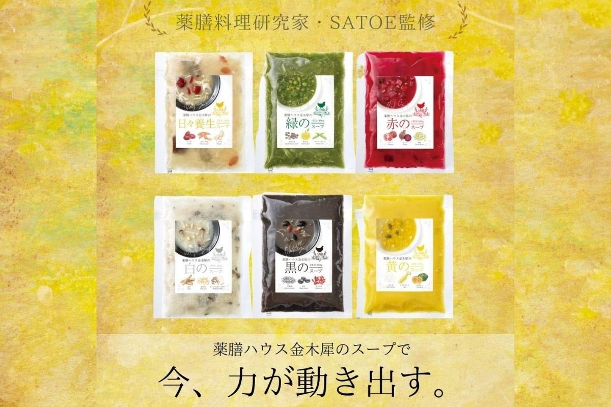 国際薬膳師の資格を持つ薬膳料理研究家・SATOEが約二年間の歳月をかけ、6つのスープを作り上げました。素材の組み合わせ方、丸鶏スープとの相性、ご家族皆で楽しんでいただけるよう最終的な味の調整など、細部までこだわりぬいた薬膳スープです。