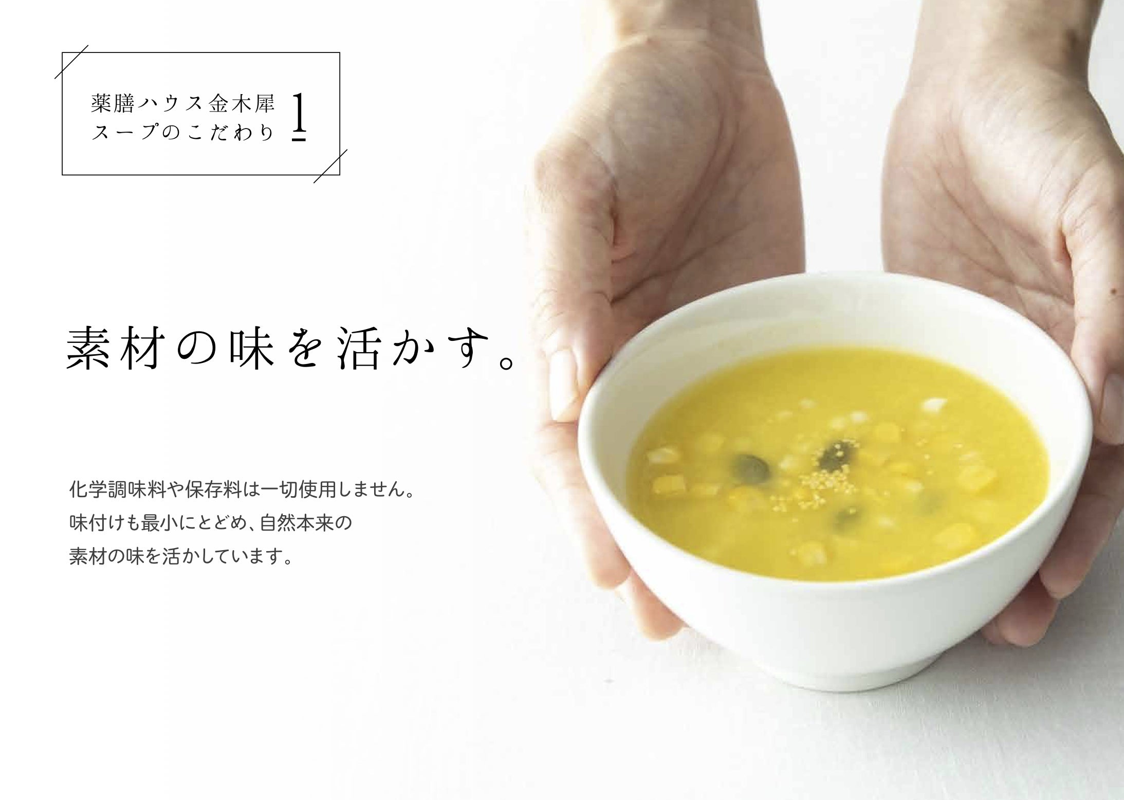 薬膳ハウス金木犀のスープは、無添加、化学調味料・保存料不使用、徹底的に素材にこだわったスープです。素材の風味を活かした優しい味わいをご自宅てお楽しみください。