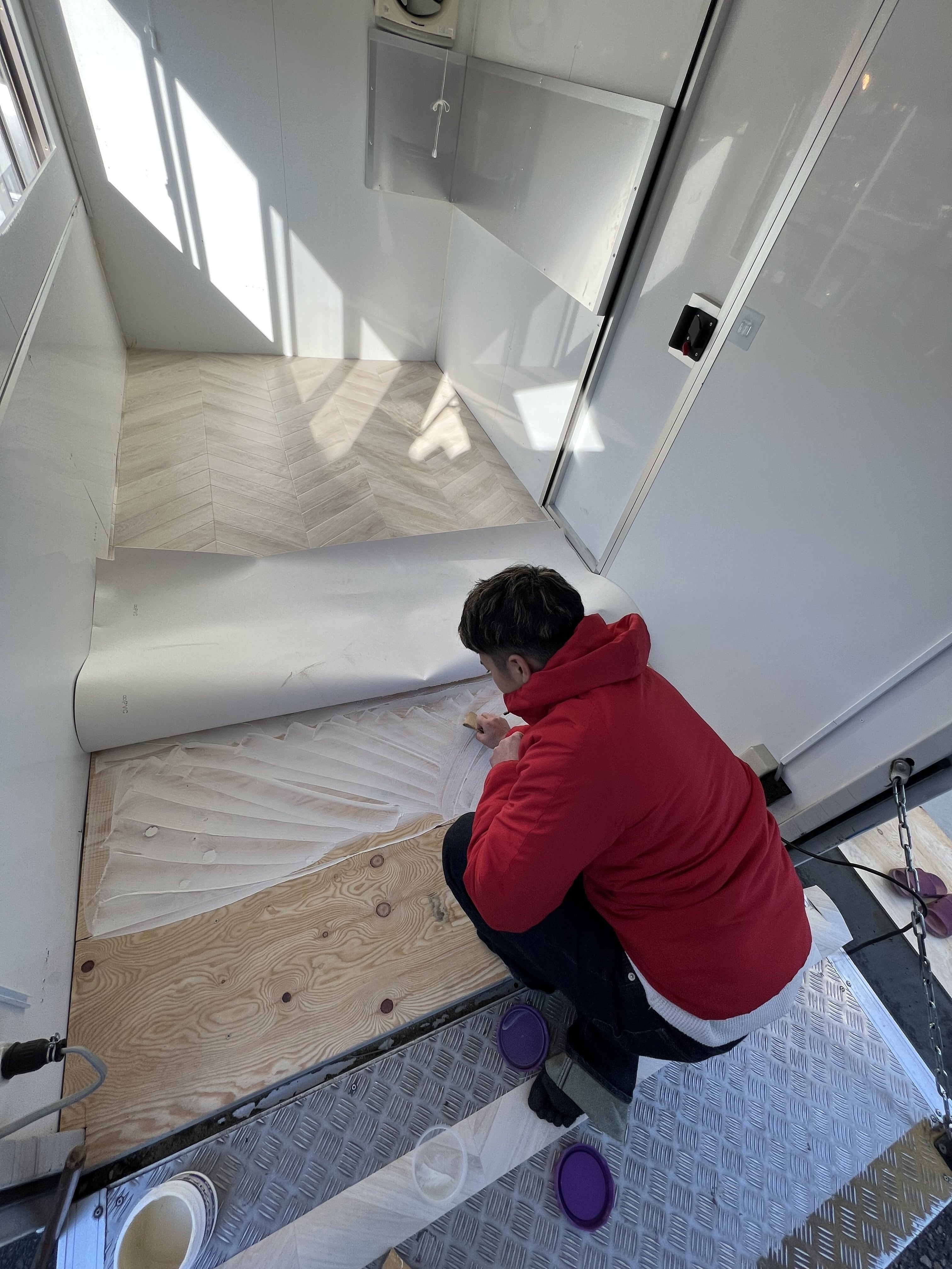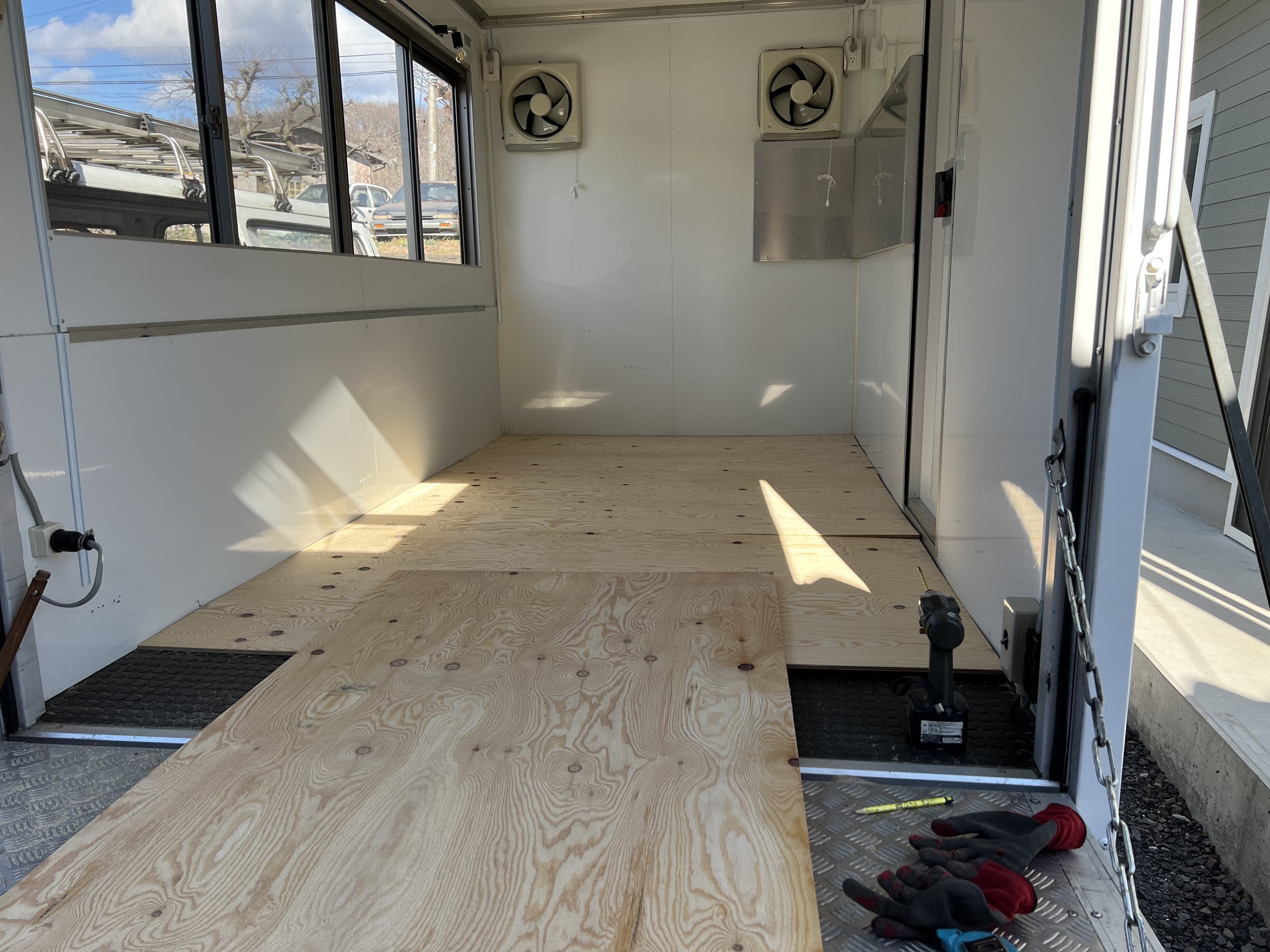 昨日はその始まりとしてトラックの床を貼り直しました!底冷えからくる寒さを少しでも軽減するため再度板張りをし、クッションフロアを貼りました!