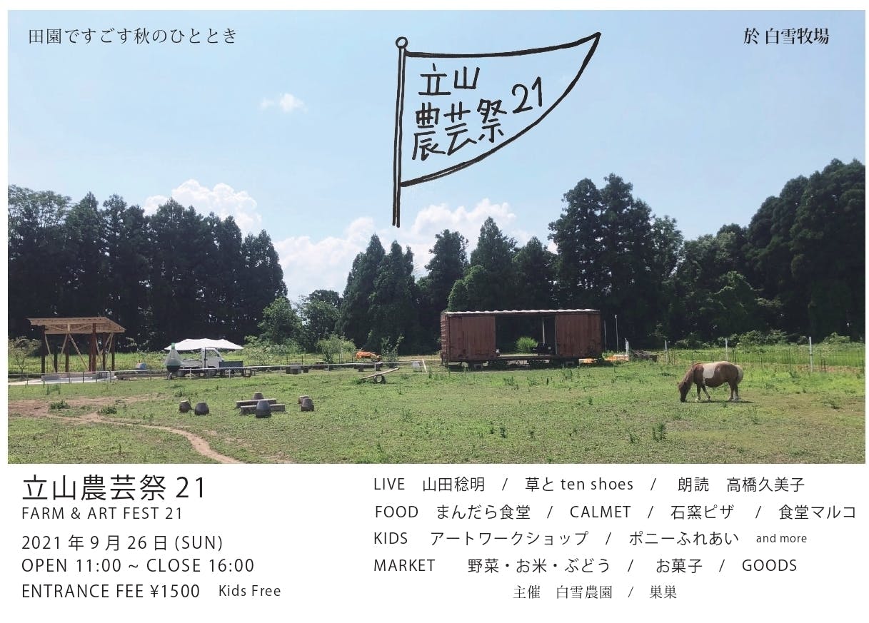 2022/01/29 22:33白雪牧場プロジェクトへの応援ありがとうございます。プロジェクトオーナーの坂口 創作です。前回は白雪牧場プロジェクトの工事完成の模様をお伝えしました。振り返ると、6月末に廃屋の解体かららはじまり、整地、ピザ小屋づくり、トイレ・アウトドアキッチン整備と、10月末の完成までほぼ4ヶ月間の工事が続きました。ところで、白雪牧場プロジェクトは、あらたな牧場を作る取り組みですが、牧場づくりには二つの柱がありました。ピザ窯・キッチン・トイレを作るといった工事が一つの柱。一方、生まれ変わった牧場と様々な人を結びつけて、やってくる人たちの楽しみや地域の新たな可能性を拓くことがもう一つの柱でした。今回は、工事が完成した牧場という箱に、楽しみやつながりを作りながら魂を入れるものとした「立山農芸祭」(11月3日開催)について紹介したいと思います。少しさかのぼると、2020年9月のSDGウィークにあたる週末、いろいろな人に牧場を知ってもらい楽しんで貰おうと、牧場を開放して「オープンファーム」イベントを行いました。「オープンファーム」では、その年に東京から移住し、近所の古民家で素敵な雑貨店とカフェ「巣巣」を営む岩崎さんによって、コンテナカフェも登場。オープンカフェ「巣巣」原っぱでのんびり原っぱの放牧場にコーヒースタンドがあるだけの素朴なイベントでしたが、秋晴れに恵まれ、友人や地域の人々が集まり、青空の下でコーヒーを楽しんだり、子供たちが虫をとったり馬と触れ合う、のんびりとした時間が流れました。オープンファームが終わって片付けをしていると、「ライブとかあってもいいかもね」と、巣巣・岩崎さんがアイデアをくれました。翌年の夏、牧場工事を進めるかたわら、「新しい牧場が完成したら何かもっと面白いことをやろう」と岩崎さんと構想を練りました。その中で生まれたのが、「田園で農と芸を楽しみながら秋の豊かな時間を過ごす」フェス「立山農芸祭」( Farm & Art Fest 21)です。コーヒースタンドだけだった前年の「オープンファーム」から、「立山農芸祭」では、音楽ライブ、フードスタンド、アートワークショップ、農家による野菜販売も新たに行うことに。特に、岩崎さんのつながりで、シンガーソングライターの山田稔明さん、作家詩人の高橋久美子さん、店主バンドの「草とTen Shoes」のライブ出演も決まりました。コロナの緊急事態宣言で当初予定の9月末から、11月3日の文化の日に開催は一度延期となりましたが、イベントパートナーの岩崎さんや出店する方々の協力でチケットは売り切れ完売。直前の10月30日に工事も終わり、無事に開催できることになりました。イベント当日の11月3日、開場前準備の時にはあいにくの小雨。しかし、開場前にすっと雨はやみ、次第に晴れ間が覗くように。続々と牧場に人が集まり、普段は静かな牧場が賑やかな空間となりました。大人は、フードスタンドの美味しい料理を味わいながら、おしゃべりやライブをめいめいに楽しむ。子供は、馬と触れ合ったり、自由に原っぱを駆け回る。思い思いに時を過ごす豊かな時間が流れました。また、コンテナステージから奏でられる音楽によって、会場の空気は一変。田園風景の中で、人、自然、文化、動物たちが一つとして解け合う特別な一日となりました。沢山のひとが集まりました青空に向かってアートワークショップ自由に過ごす馬もお洒落に変身馬とふれあい焚き火の焼芋屋さんもところで、「立山農芸祭」は、芸術や食といった秋の恵みを楽しみながら、豊かな時間を過す場であることを願ったものです。それに加えて、もうひとつ願っていたことがありました。それはつながりから、新たなつながりや可能性を作ることです。実のところ、農芸祭は、何千人と集まる大きなフェスと比べたら、かなり小さなものです。そして、企画、告知、販売、出演、出店、会場準備と、全てつながりのある人たちの協力を仰ぎながら作った手作りのイベントです。やってきた人たちは、何らかのつながりでやって来た人たちが殆ど。そのため、アットホームな大きなホームパーティーのような雰囲気が会場に漂いました。その中で、集まった人たちの中で新しい出会いがあったり、やりとりの中で何かを一緒にすることになったりと、ちょっとした展開もあったようです。農業、芸術、地域、自然、人々をつなぐことで新たな可能性を生めたらとの思いで始めた「立山農芸祭」でしたが、楽しみだけでなく、出会いやつながりを育む場としてもあったことは、今後の展開が楽しみなところです。仲間や家族と出演者同士(ドラムと和太鼓)これからについては、巣巣・岩崎さんとの相談して少し工夫と改善をしながら、今年も秋にまた「立山農芸祭 22」を開催できたらと思います。白雪牧場を舞台にした「立山農芸祭」が、地域の秋の風物になる時もいつの日か訪れたらと思っています。次回はリノベーション後の白雪牧場で