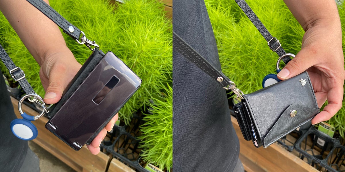 ※ガラケーはバッテリー交換ができる旧型のものだと、背面の蓋が外れる仕様です。そのため上記の使い方をした場合は、歩く振動で蓋が外れガラケーが落下する場合もありますのでくれぐれもご注意ください。