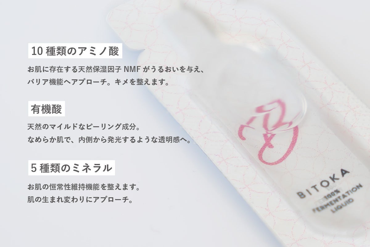 人工的に作られた美肌成分を足し合わせた化粧水ではなく、天然由来の素材を発酵させてできた美肌成分のみ。水などで美肌成分を薄める希釈なしの贅沢な100%発酵化粧原液。全成分表示は3つだけ。防腐剤、着色料、香料、界面活性剤、鉱物油などのオイルやアルコールも、もちろんフリー。