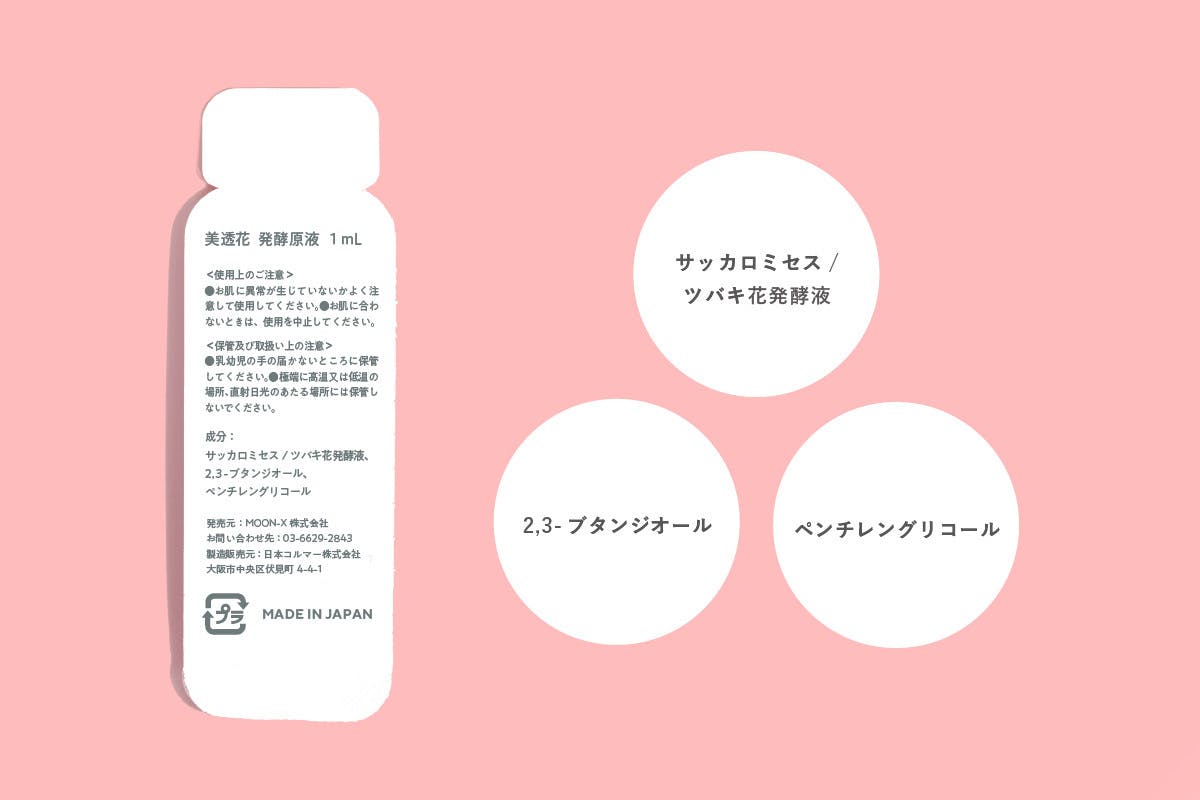 美肌成分たっぷりのツバキ花発酵物が詰まった発酵原液を、毎日フレッシュな状態でご使用いただくため、1回分ずつ個包装。2ndゴール達成で個包装でのお届けとなります。