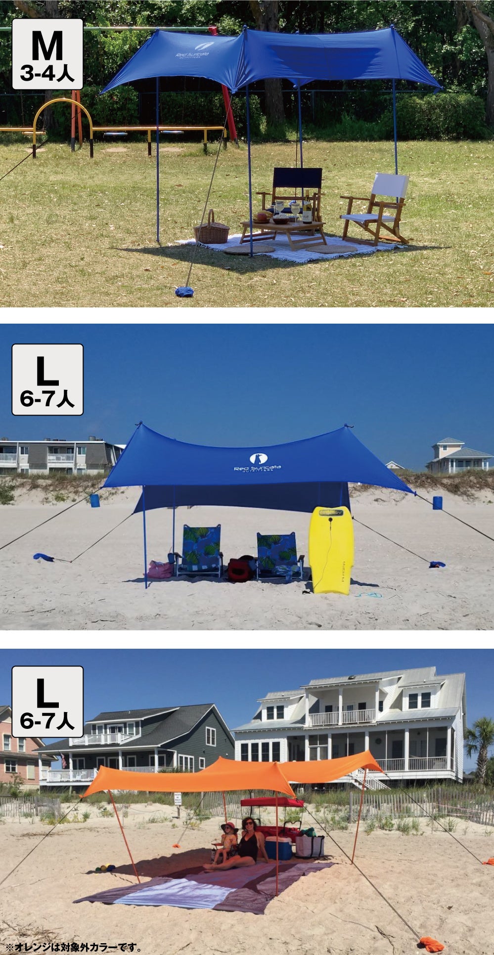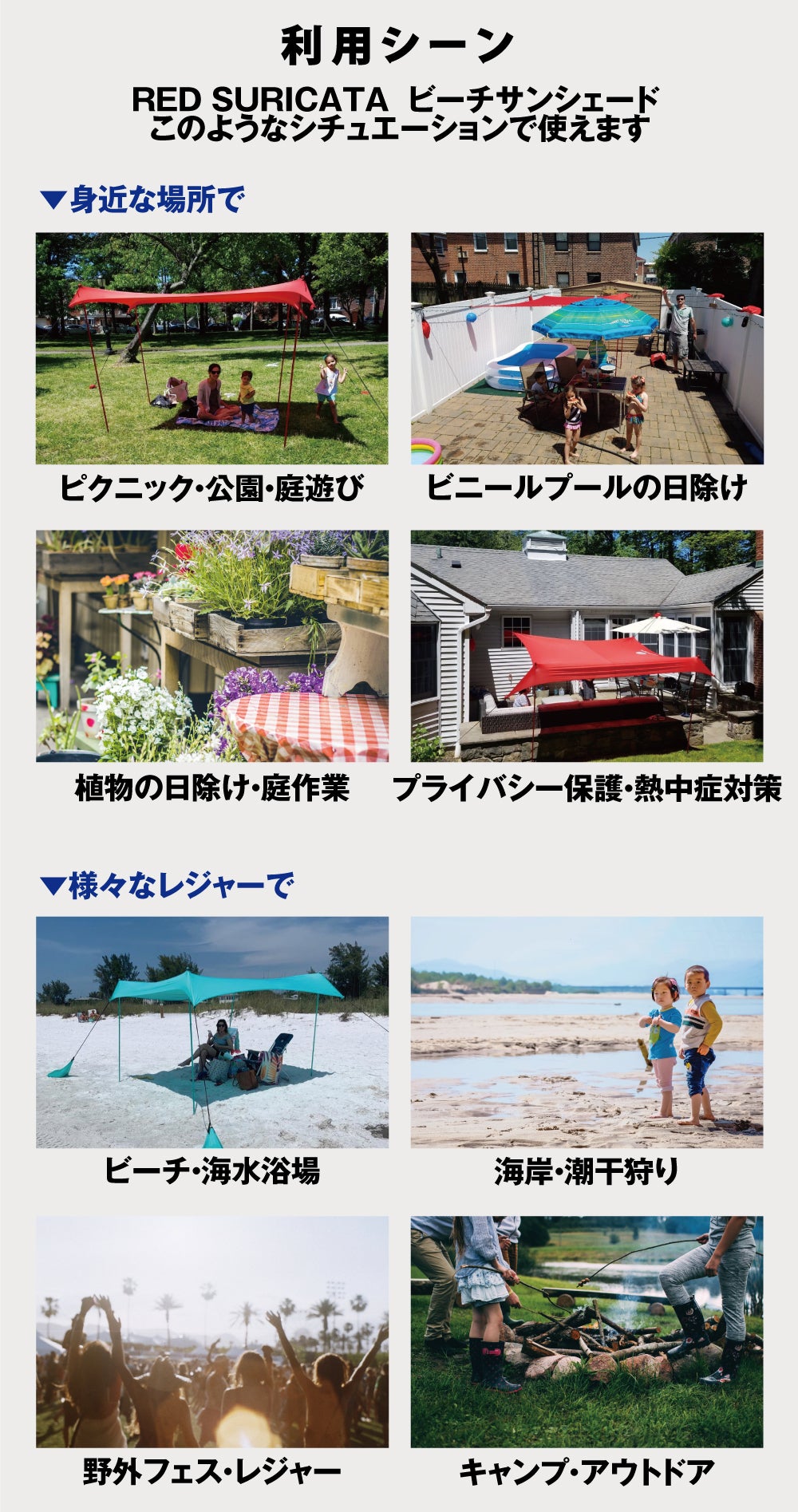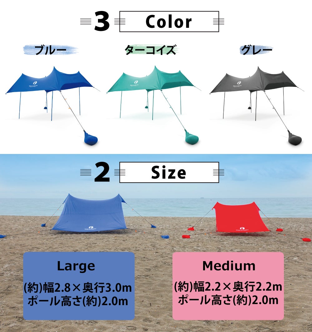 海水浴場やキャンプなどのアウトドアではもちろん、野外フェスなどの各種レジャー、おうち時間の充実に、お庭でおうちキャンプ、バーベキュー、公園やグランドでピクニック、ビニールプールや植物の日除け、プライバシー保護や熱中症対策にも活躍します!