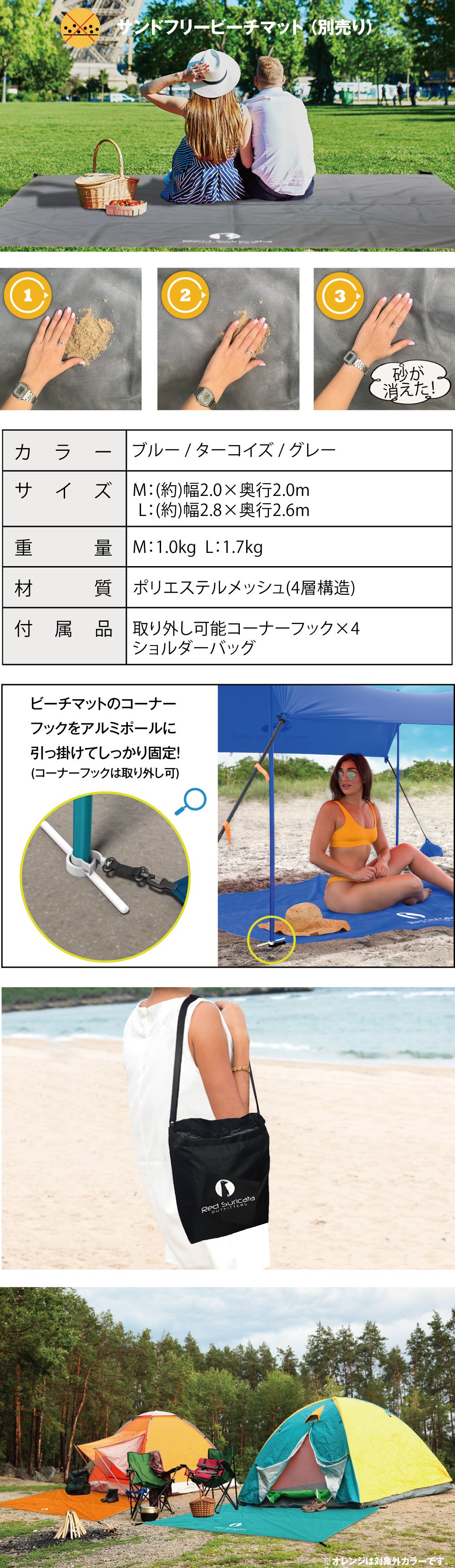 砂が消える!!ビーチマットに砂が乗っても、手でさっとこすれば下に通過します。下から上には砂は通しません。水分も透過するので、お茶やジュースをこぼしても下に通り抜け、サラサラで快適!ビーチはもちろん、公園、運動会、キャンプなどのアウトドア全般で活躍します。