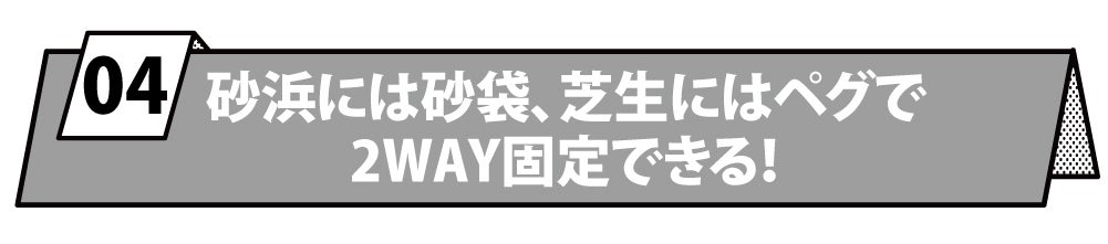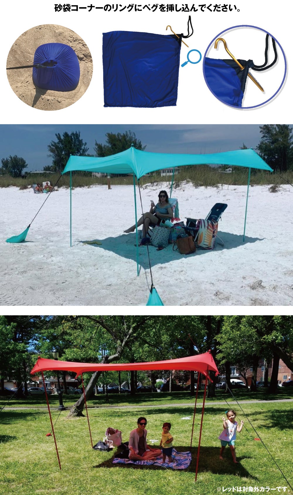 ビーチでの砂袋はもちろん、付属のペグを使えば芝生などにも設置できます。砂袋のコーナーにリングが付いているので、そこにペグを挿し込んで固定してください。