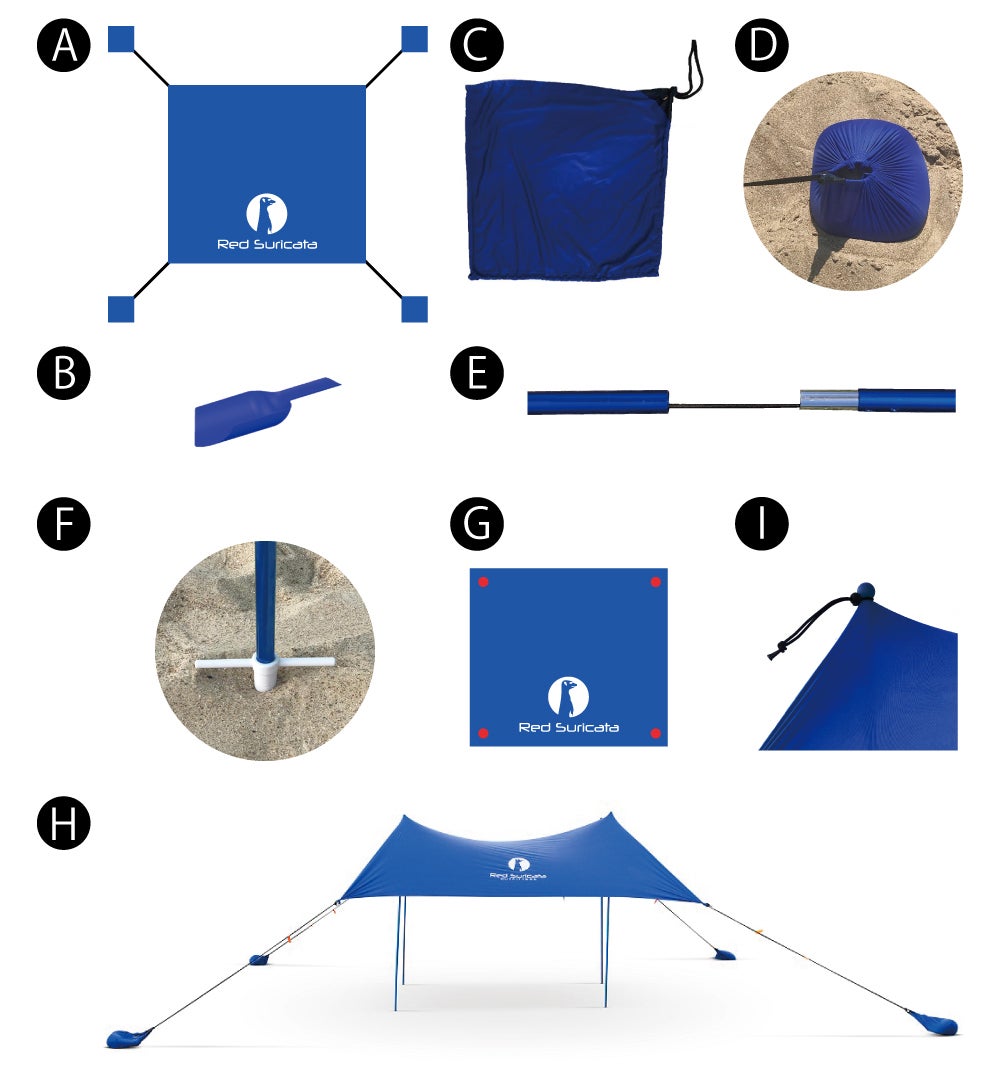 7)サンシェードをできるだけしっかり張るために砂袋を引き離します。この時、Xの形を維持できるよう、対角線のバランスに注意してください。風が強い場合は、砂袋の一部または全部を砂の中に埋めて、上にさらに砂を積みます。4本のアルミポールと4ヶ所の砂袋の重さで固定されます(H)