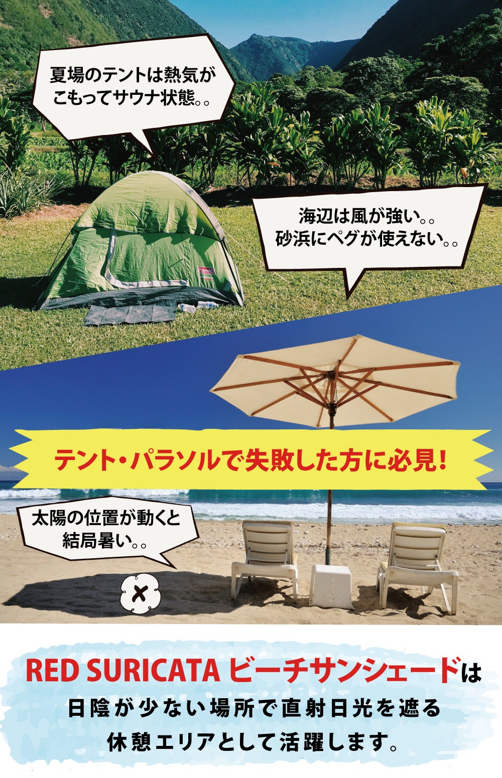 今回ご紹介する「RedSuricata ビーチサンシェード」は軽量・コンパクト、どこへでも持って行けて、セットアップも簡単なこんなの欲しかったと感じていただけるプロダクトです。暑い日差しを遮る快適な空間づくりのサポートとなり、皆さまのお役に立てれば嬉しいです。