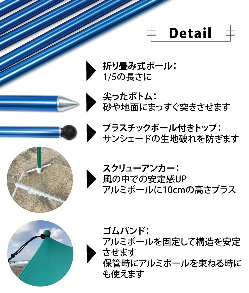 A.アルミポールの先端は砂に中に30cm程度挿し込む必要がありますので、アルミポール高さは約1.7mです。手が届かない場合はお持ちのイスや台を使って、アルミポールトップの外側にゴムバンドを結んでください。難しい場合は、先にアルミポールのプラスチックボール付きトップ側をサンシェード生地にゴムバンドで結んで固定してから、アルミポールを立ち上げてください。