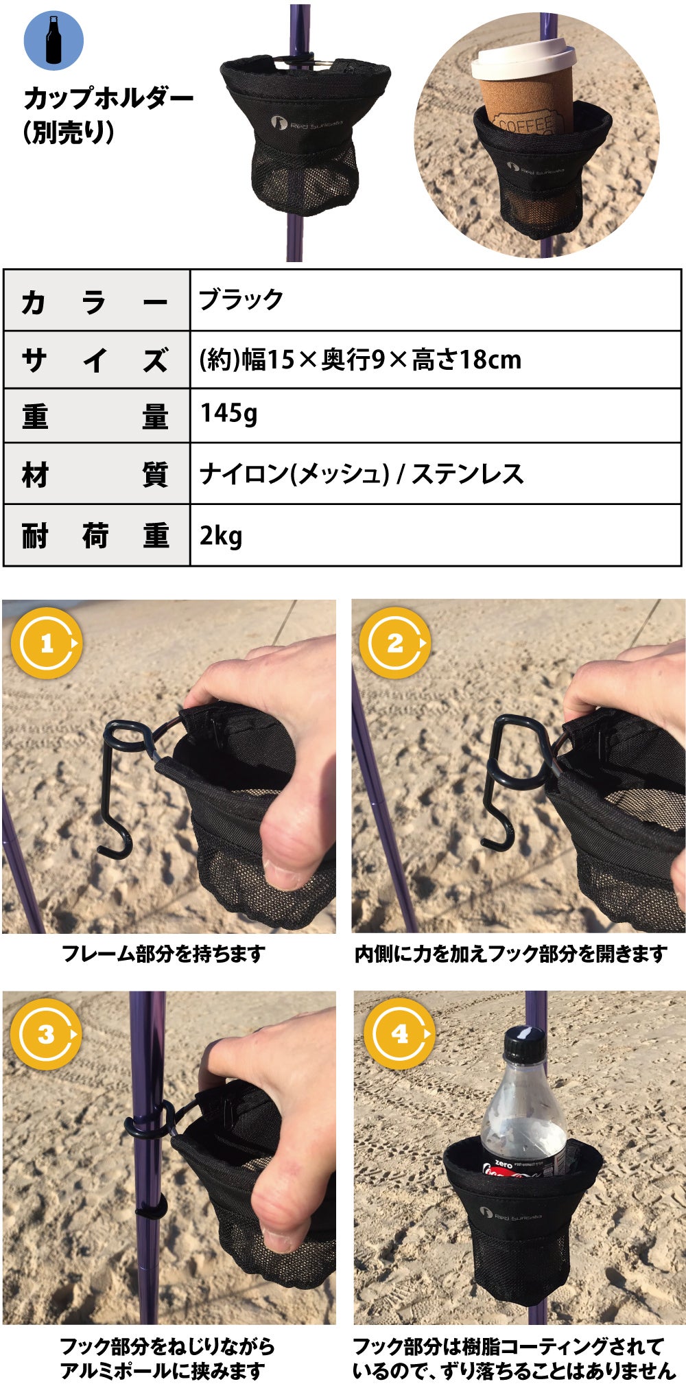 アルミポールに簡単に取付けられるカップホルダーです。ペットボトルや缶ビール、コーヒー入れに!サングラスなどの小物入れ、スマホのちょい置き場としても便利!