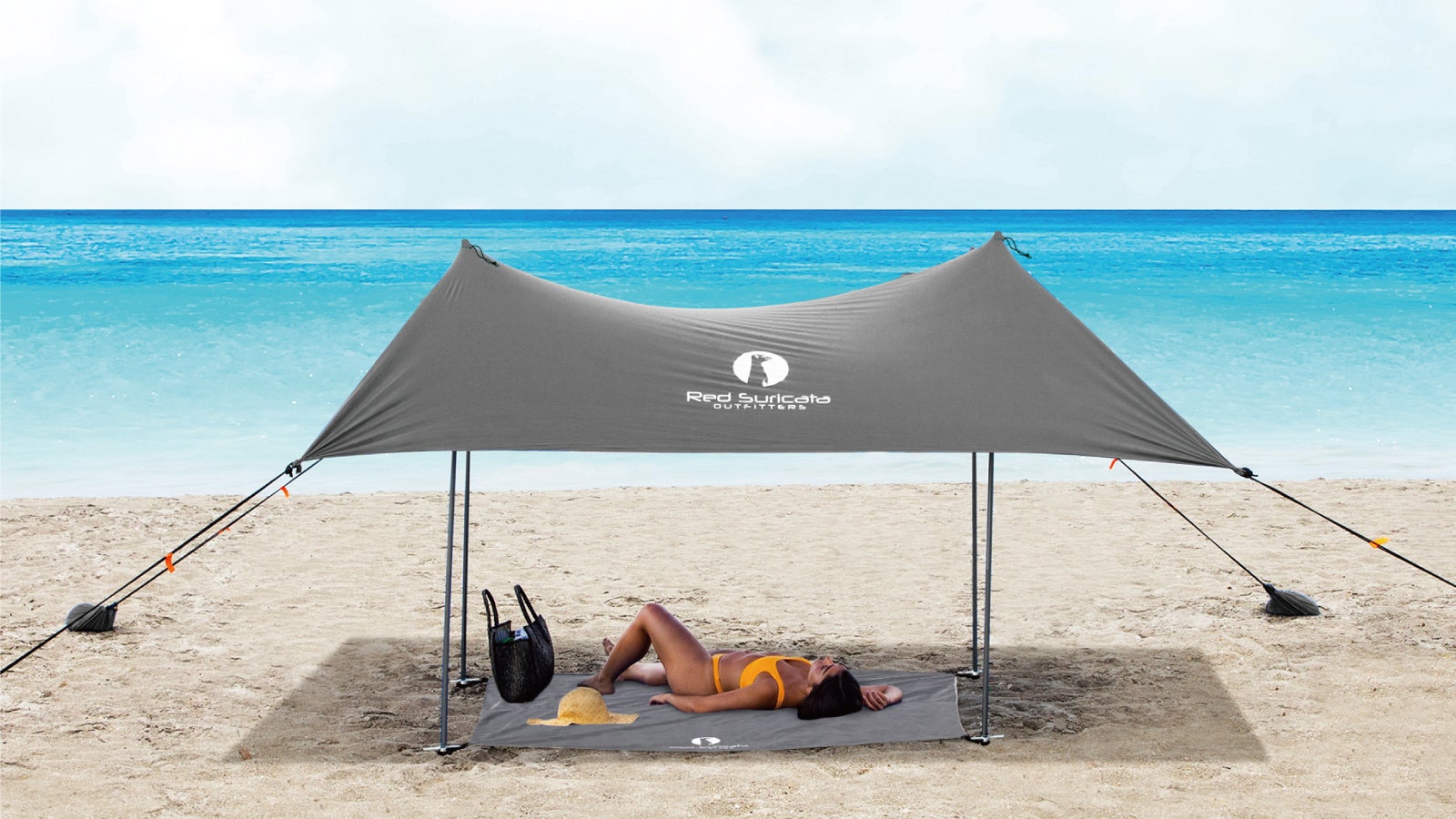『RedSuricata ビーチサンシェード』は日陰が少ない場所でも直射日光を遮るサンシェルターです。伸縮性に優れたライクラ生地だから、使用するアルミポールの本数を調整して、簡単にサンシェードの角度を変えることができます。太陽が移動しても快適な日陰エリアが作れます。
