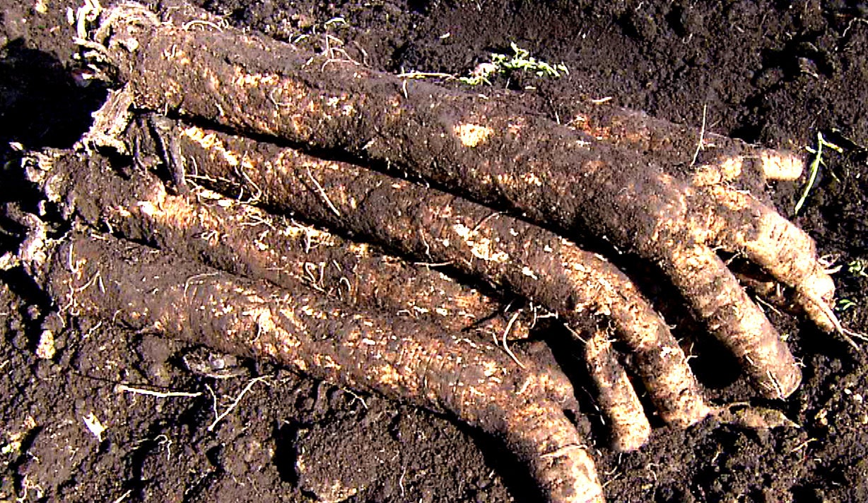 直径10センチにもなる別名「おばけごぼう」と呼ばれる「堀川ごぼう」を