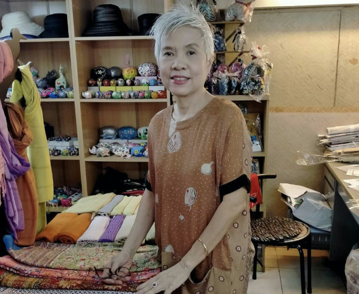 ▽縫製工場のオーナー「オランさん」。観光客向けの小売店も営んでいます。